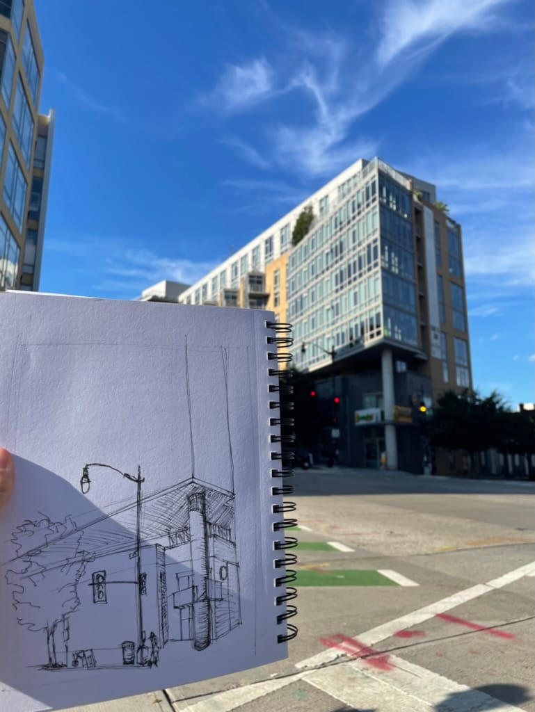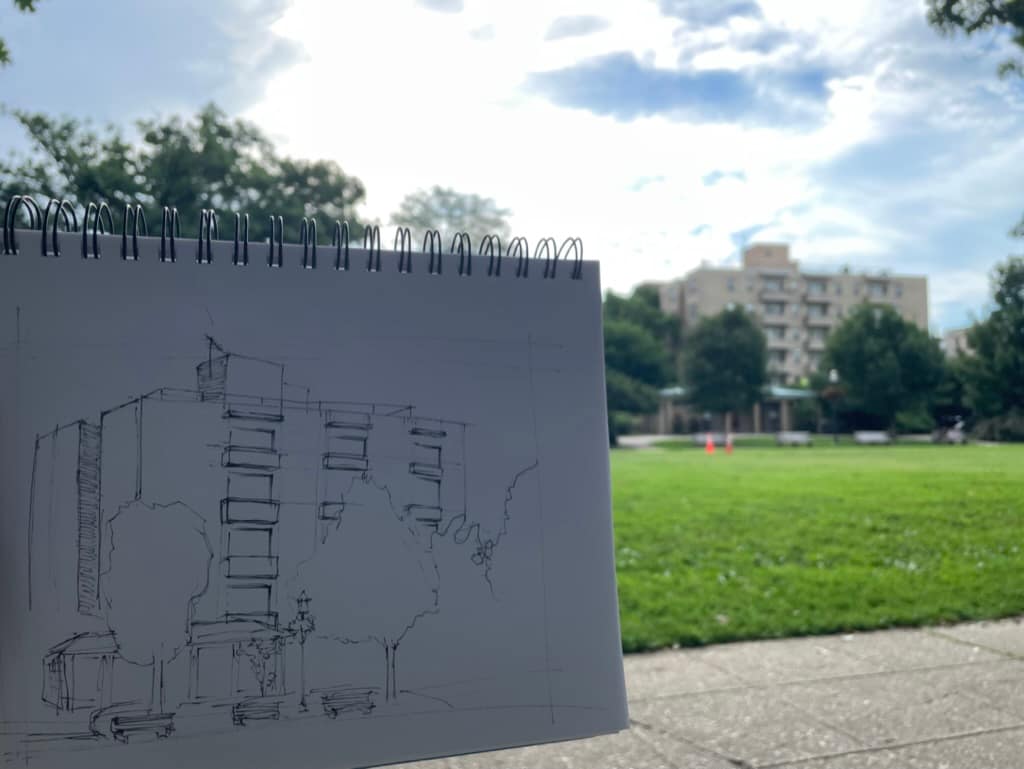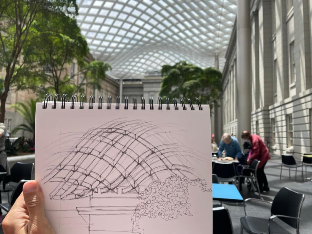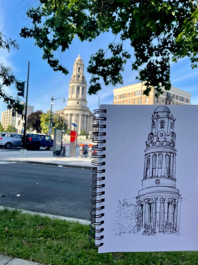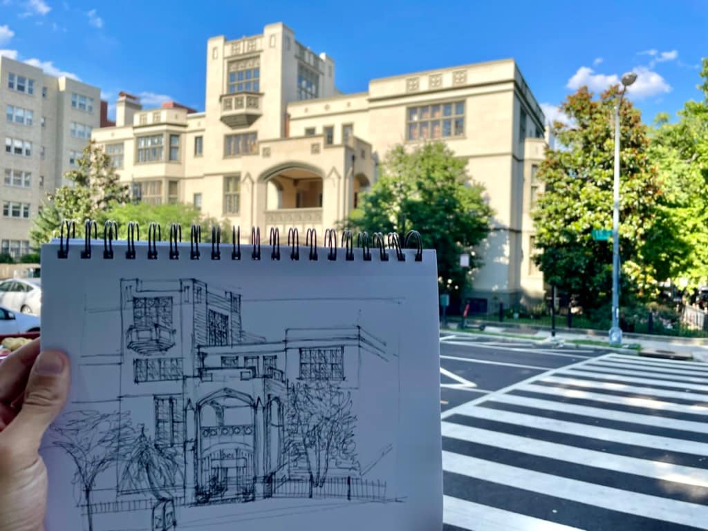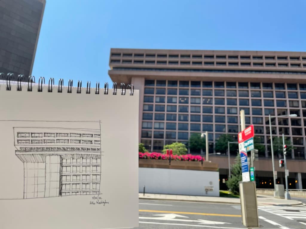 In 83 days, I completed 77 sketches. My first sketch was on May 22nd of the Hilton Washington next to L’Enfant Plaza and my last sketch was done on August 13th of the grand hall of Union Station. On average each sketch took me about 20 minutes. My usual routine consisted of me getting home from work between 5:30-6:00pm, changing out of work clothes and then walking around Columbia Heights to find something to sketch. On the weekends, I traveled to the museum/mall area, so content-wise they were different than my week-day sketches. On Wednesday I went salsa dancing, which left me very little time between getting home, eating and leaving, so I didn’t have time to sketch on those days and for the first few days when I had covid I couldn’t do anything. To make up for it, I sketched twice a day for a few days.