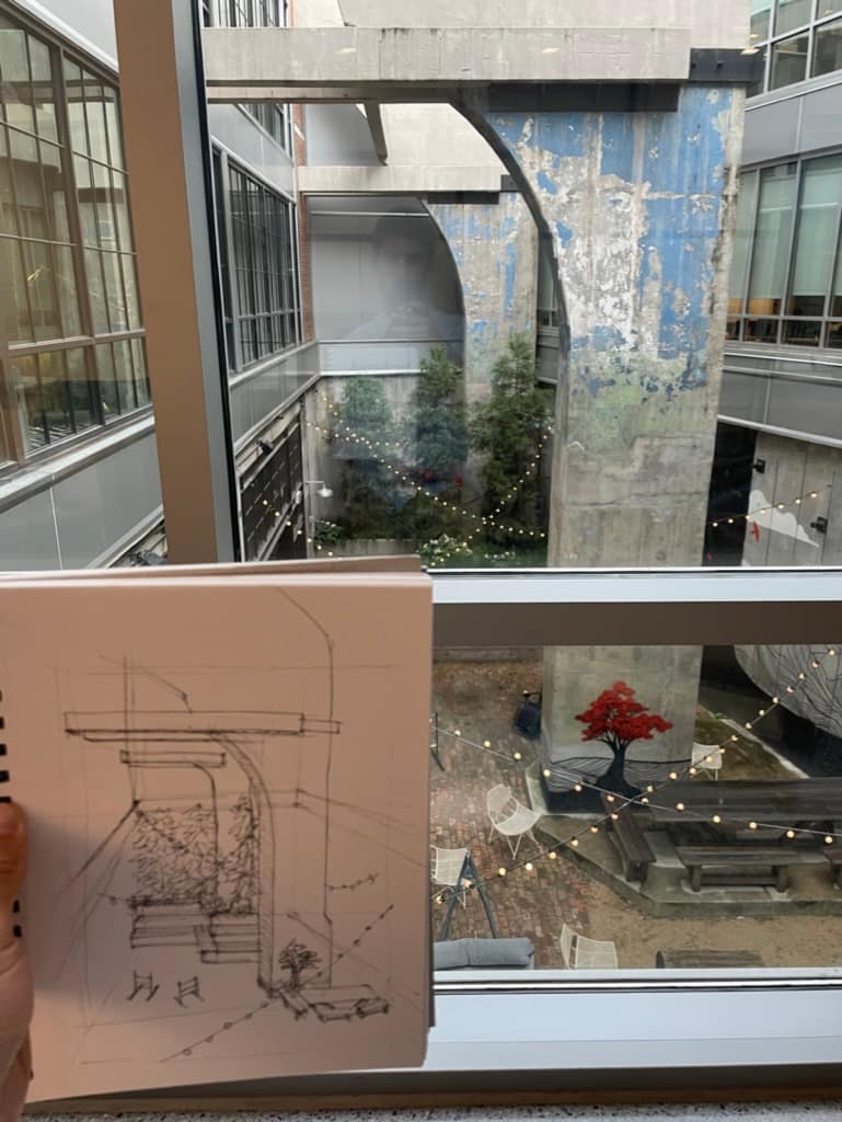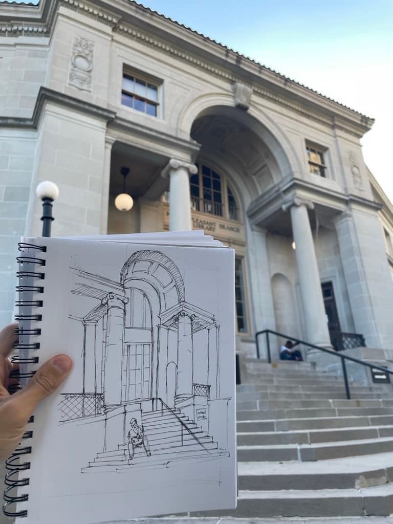In the beginning, I was sketching to copy. I was sketching what I saw. I don’t think this is necessarily a bad thing, but at the same time I did my last sketch with the sharpie ultra fine, I had been talking with my professor via email about sketching. In the image of the sketch I sent him, he commented about how it was crooked and I confirmed that it was crooked. I was standing holding the sketch pad and it’s hard to get things right. It wasn’t a sufficient excuse for him. What he didn’t see were construction lines. Construction lines are faint lines, “traces” of how you compose the sketch. Like someone who draws an oval before drawing a face. Construction lines help give a visual understanding of the relationship between certain forms (wall to window, arch to door, etc). After our conversation, I tried to be more conscious of what I was sketching and the relationship between the parts and the whole of what I was seeing. While being able to sketch isn’t a requirement for being an architect, it is a valuable skill to have. Through sketching, we better understand what is in front of us in a way that photography cannot.