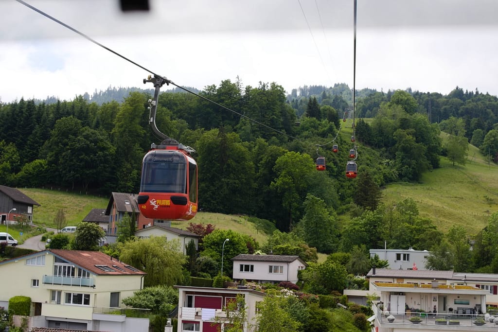 When we got off the bus, we had no idea where to go. There was a sign pointing to a funicular, but it was heading the opposite direction of the mountain and it didn’t feel like the correct direction. Other than that, there were no signs and the cable car wasn’t showing up on the map. Going off intuition and Google maps, I guessed the direction we had to go. We followed a rural road through a quaint village, passing a school and fields, until we finally saw a sign in the direction we were heading for. My sister, who had been less confident about our direction, finally breathed a sigh of relief as we realized we were on the right path. Every so often we’d see a bright red cable car take off toward the mountain.