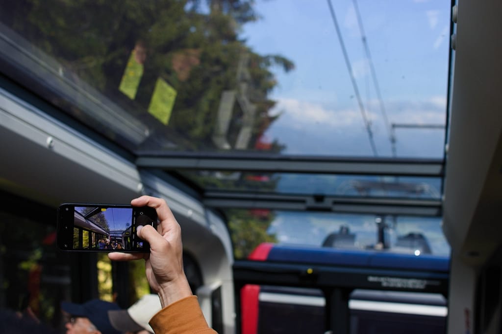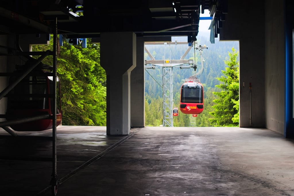 The first car was no bigger than a phone booth, but smaller in height. As it slowly ascended the mountain, the town gradually receded behind us, replaced by an endless expanse of trees and forests. Hikers traversing trails passed below us and we occasionally heard the distant ringing of bells from mountain lodges nestled on the slopes. As we passed the first station, the activity below us picked up. What looked to be a summer camp with kids made their way down the trail. Signs at the station for hikes pointed in various directions.