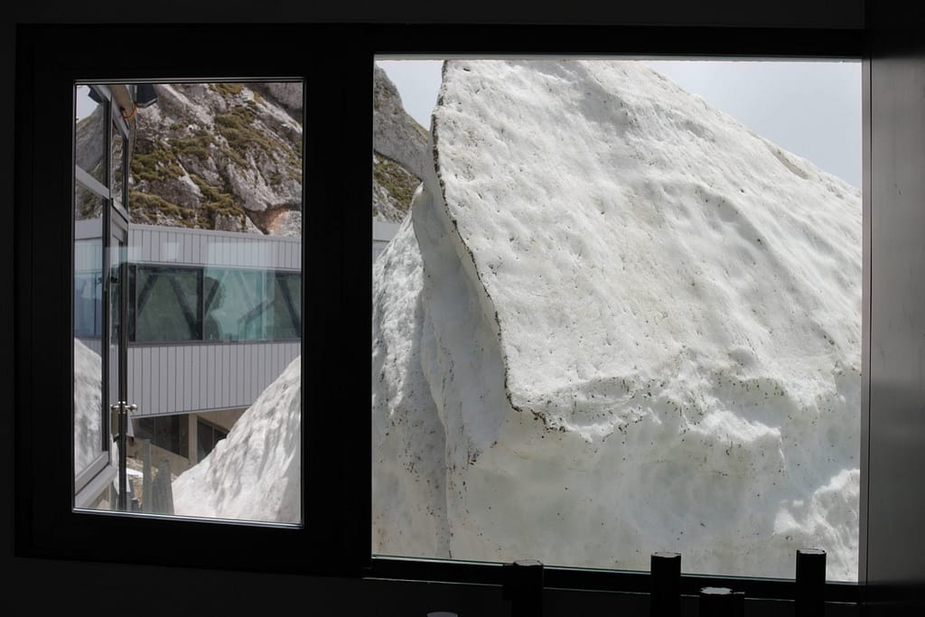 The second cable was massive, like four elevators put together. It was also a lot faster and steeper, zooming off like the launch of a rollercoaster in an almost vertical-like direction. It was packed with people and clouds had rolled in so that car was blanketed in white. The view was nothing but clouds, except the occasional jagged, snow-covered edge of the mountain piercing through as we zipped past. As the ascent slowed, the last cable station came into view. We had made it to the top.
