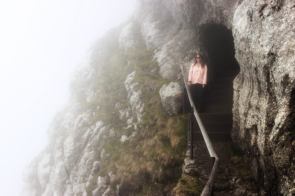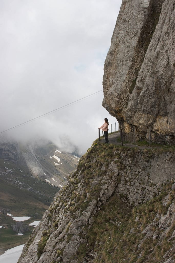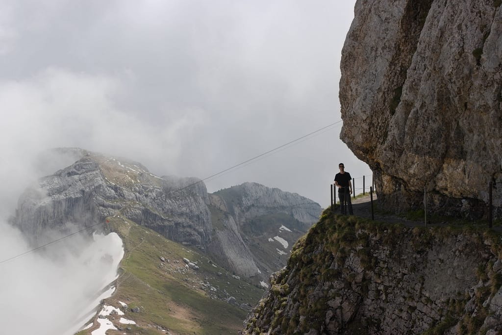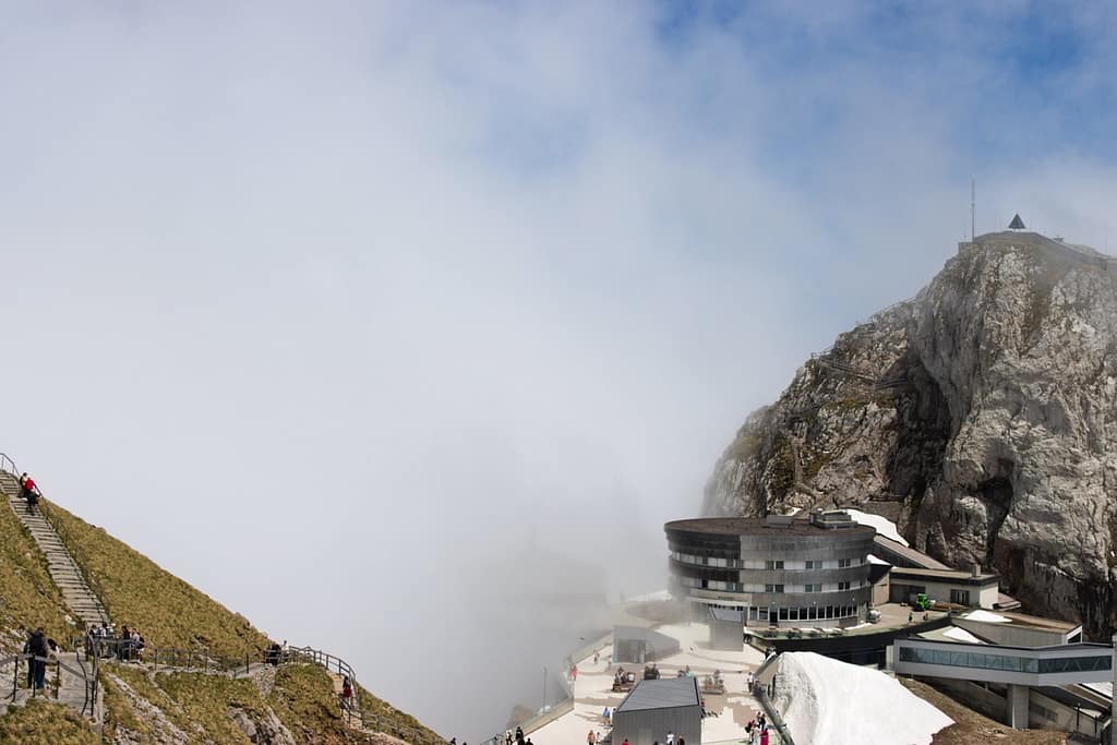 The top of Mount Pilatus was like a little Alpine resort. I’ve never seen such a fully developed mountaintop. The cable station had a few luxury shops, a hotel-like kiosk and some places to get food and drink. Above and in the open air were two hotels, one a circular building and the other an old-looking stone chalet. On one side, the one we came up the mountain was a steep precipice, while the other was a gradual snow-covered inclined dotted with the occasional hiker making their way to the top. It was mid-June and there was still snow at the top! Two peaks were on either side, one was closed, so we climbed up a few steps to the other. The weather fluctuated between cloudy and clearer skies, but never quite clear enough to see the valley below. It was a little windy, but the sunshine made it out and with it, it was quite enjoyable.