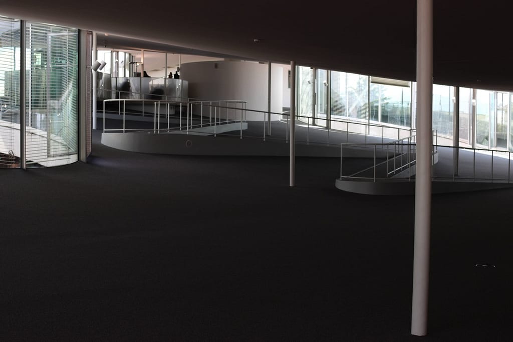 The most notable feature of the building is its fluid, undulating design, featuring sloped floors, open floor plans, and very minimal internal divisions, creating a seamless and expansive, flowing space. From above, it’s a giant rectangular piece of Swiss cheese, with holes punctured throughout that not only allow light into the spaces, but because of the undulating floor plan creates pockets of courtyards, covered and sunlit.