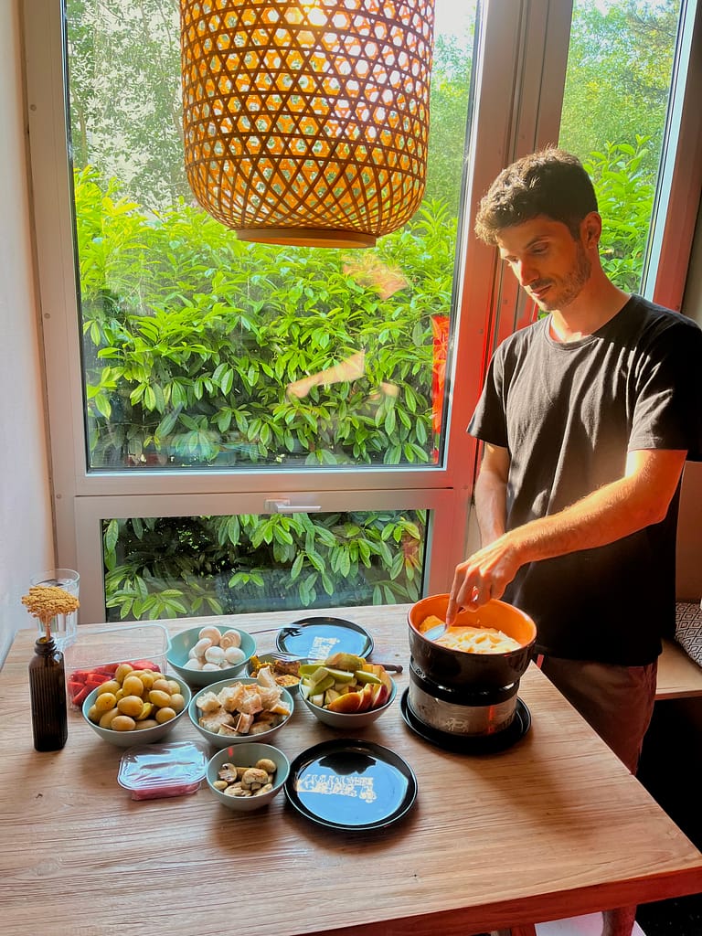After arriving back to Lucerne from our mountain visit and a short stroll around Lucerne’s historic downtown, including a walk across the picturesque chapel bridge, we headed to the store to buy our fondue ingredients. We went with the hostel worker’s recommended cheese brand and bought a cornucopia of dipping foods; bread, strawberries, mushrooms, apples, pears, baby potatoes, meat and veggie rectangle things. When we got back to the hostel, they set up the fondue set for us. We put the cheese in and we waited, and waited, and waited. It took forty to fifty minutes for the cheese to get to the fondue consistency and the whole time we were second guessing ourselves, at one point we started eating it too early, only to ask the worker and for her to tell us it needed more time. Meanwhile, in the hostel kitchen, a couple of Swiss travelers started making their own fondue, but they melted the cheese on the stove in a pan. That’s what we were supposed to do, instead we used the little fondue burner, which was like trying to cook something with a lighter. Live and learn, I guess.