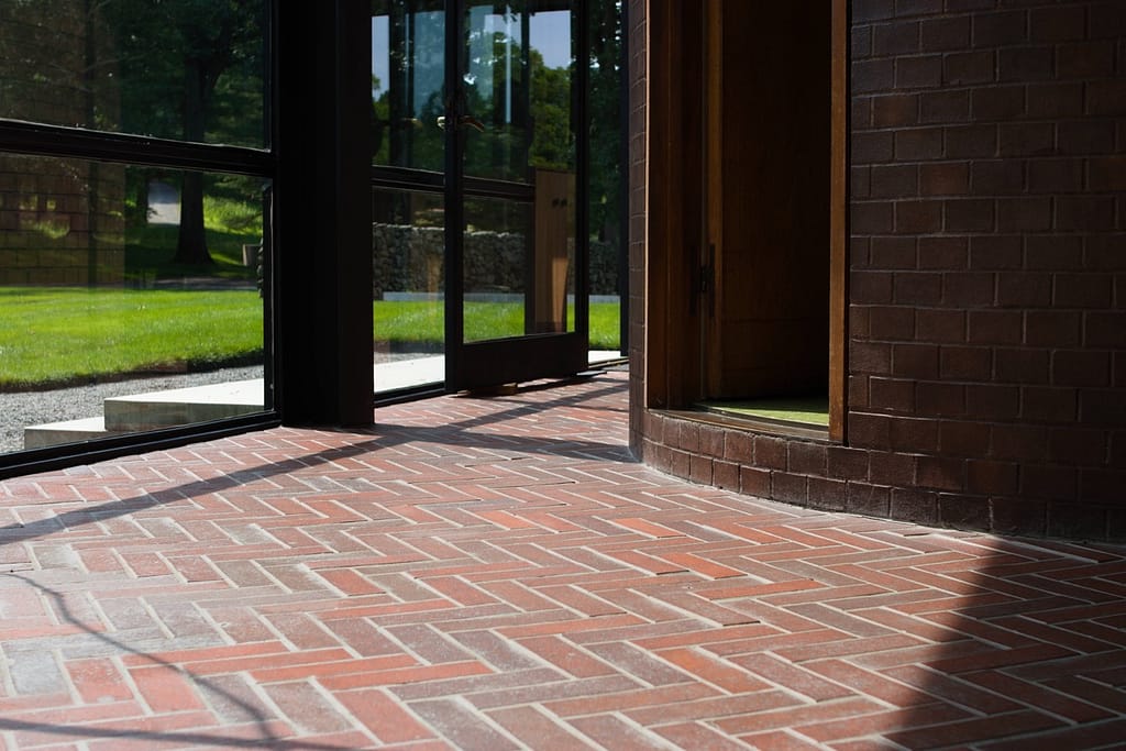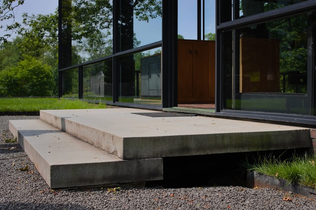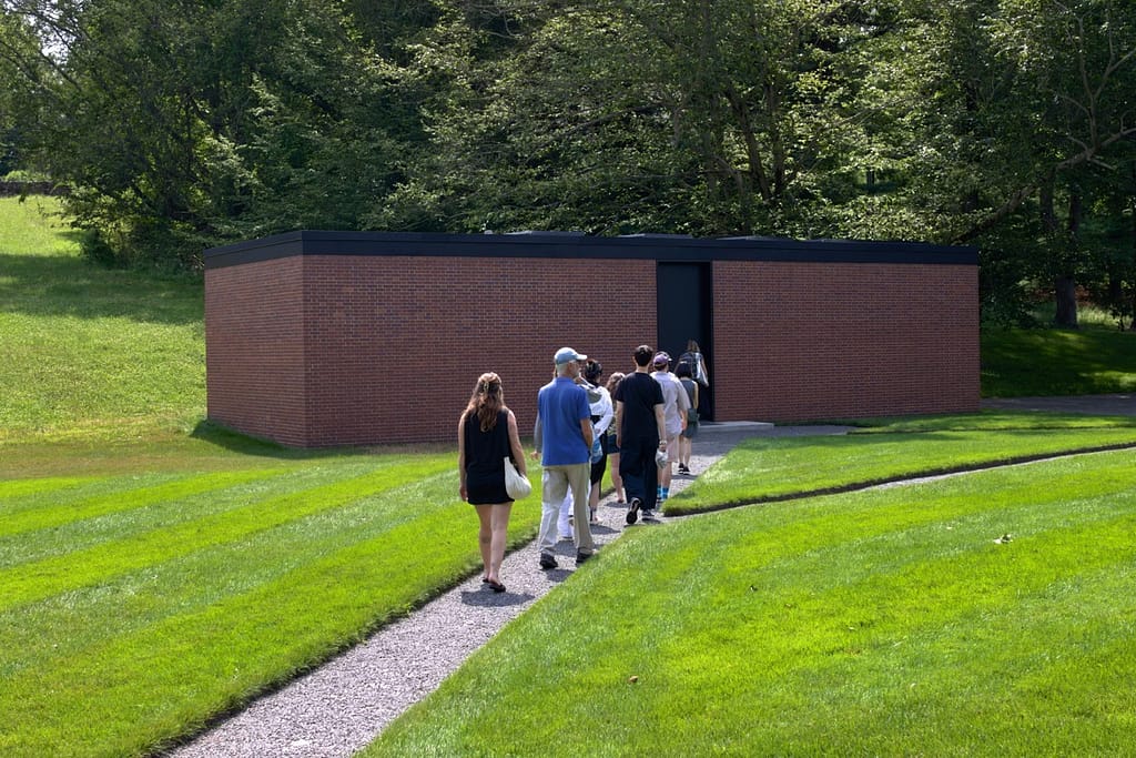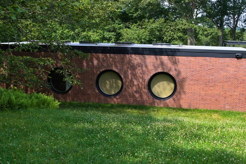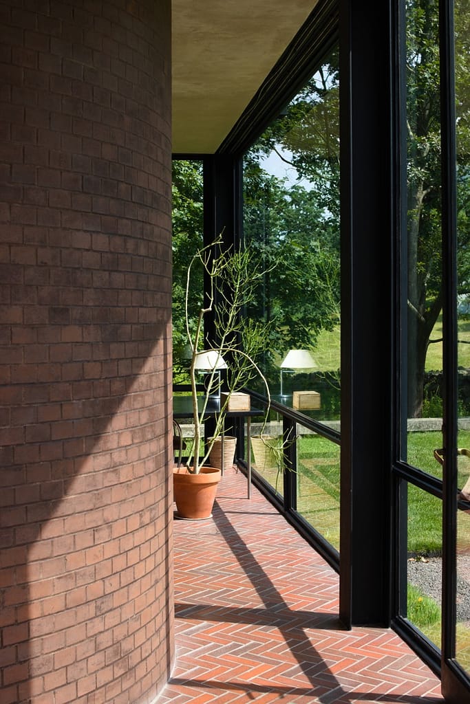 Across the lawn sits the Brick House, the guest house. It is directly across from the Glass House on the same axis, but subtly off-center. This offset introduces a quiet tension between the two. The two buildings are in conversation, but not necessarily having the same one.
