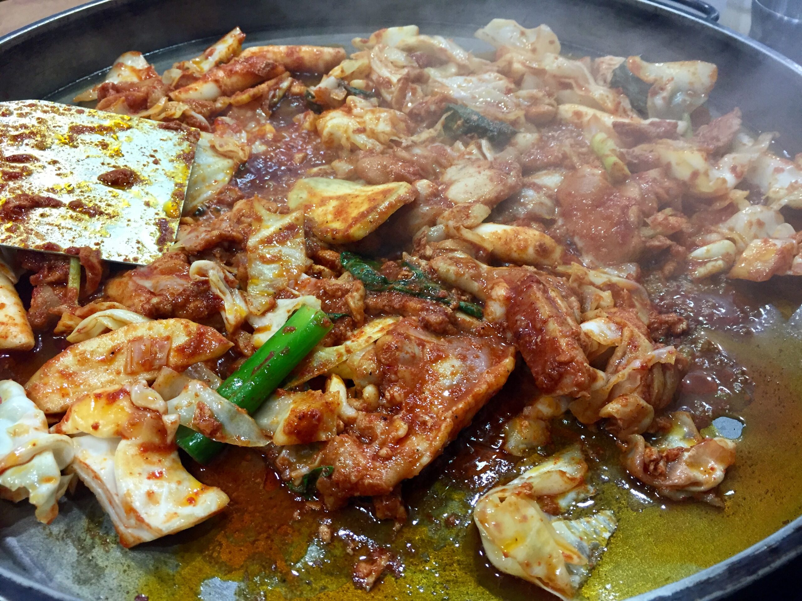 With 5 nights in Jeju, we booked four different places so that we could drive around the island and stay in that area for the night. Some friends argued against this, but it’s clearly the most logical thing to do. We planned the next two nights in the city Seogwipo, exactly South of Jeju City on the southern part of the island. Instead of going directly south to we drove around the western coast of the island. First we stopped at Hyapche beach, then continued driving west to Suwolbong peak, we then found a black sand beach right next to it where we chilled for a bit. The plan was to then go see a waterfall and a beach on the way, but Nicara messed up the spelling (it differed by one letter: Cheonjeyeon vs Cheonjiyeon) in the GPS, so we ended up at the waterfall in Seogwipo (not the one we wanted) and had to drive 25 min back to the other one. We ended the day on the surfing beach!!! It’s the only beach in Jeju that gets waves like that and it was my first time seeing real waves in a year and I couldn’t go in, like so many times in the past I’ve destroyed people’s dreams, mine too was destroyed by a lifeguard telling me I couldn’t go past my knees. For dinner we had 닭갈비 (Dak-gal-bi), made by stir-frying marinated diced chicken in a gochujang-based sauce with sweet potatoes, cabbage, perilla leaves, scallions, tteok, and other ingredients. It was my first time eating it and it was delicious.