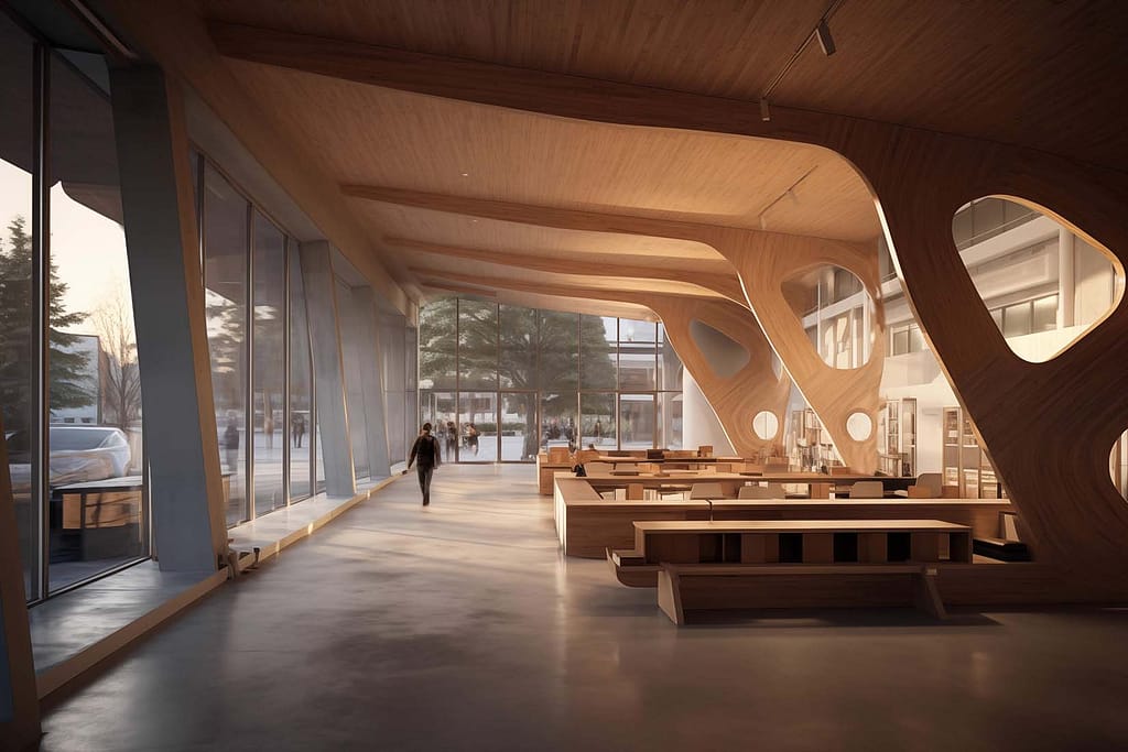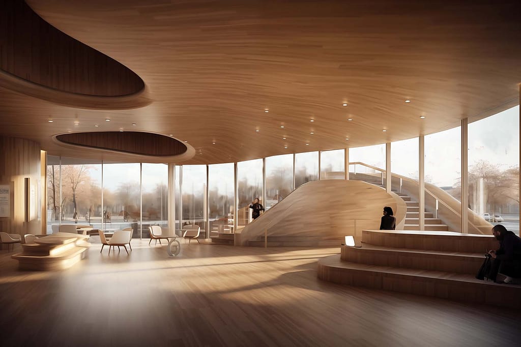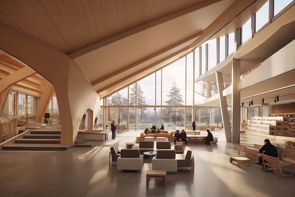 My next goal was to generate a plan. Currently there’s no way for AI to consistently generate different exterior views, or to go from the exterior to the interior. The best you can do is to attempt to make the two resemble each other. I used similar prompts that I used for the exterior rendering, but added architectural plan and a few other words. My goal was to get enough similarity so that when looked at both, you could think “okay, that could be that.” For the interior shots, I tried to reference the exterior shots, but that didn’t work too well. Instead, I tried combing two images of what I wanted the interior to look like, Studio Gang’s Gilder Center in NY, with CLT (cross laminated timber). Through a variety of variations, combinations, and words I got three images that I thought could pass as the interior. Ultimately, my attempt to reconcile the two resulted in images that approximate my vision, but fell short in scale and dimension accuracy.