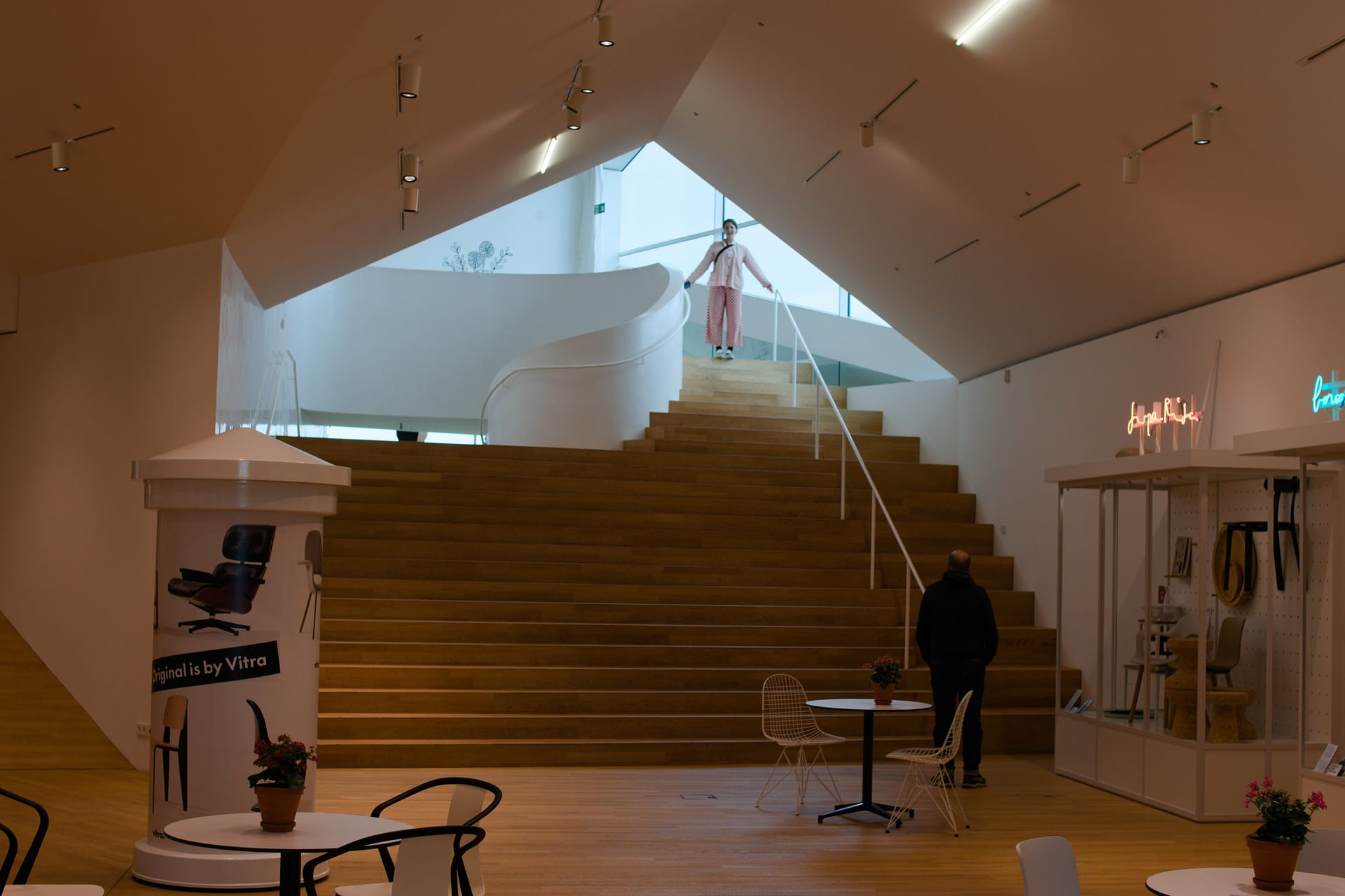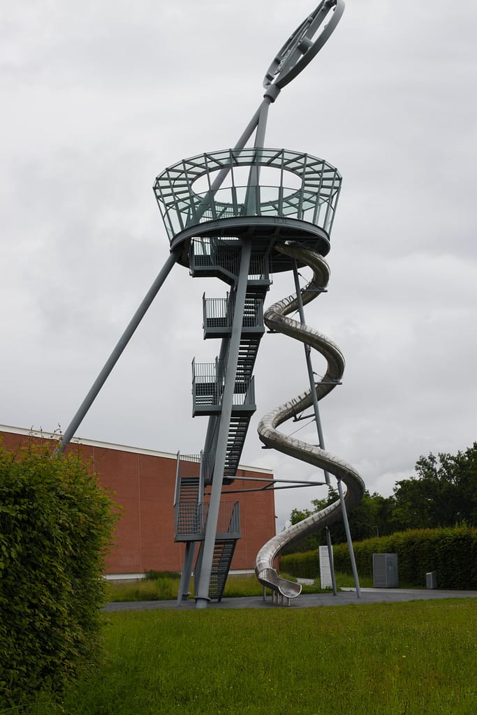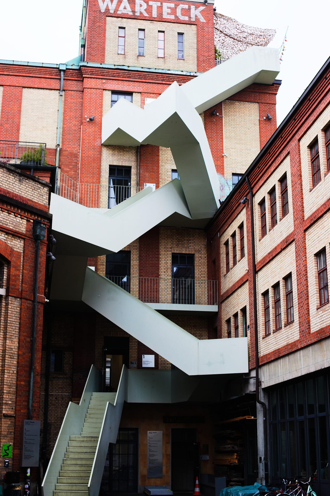 A former brewery with two giant malting towers that dot the skyline was transformed into a series of public spaces, restaurants, and at least one architecture office. Walking up the stairs, I saw the door was open and stopped in to say hi. Unfortunately, she didn’t offer me a job. In 2014, an aggressive outdoor staircase was installed to connect the floors. I saw a picture of it somewhere and as both a fan of stairs and adaptive reuse, I had to see it.