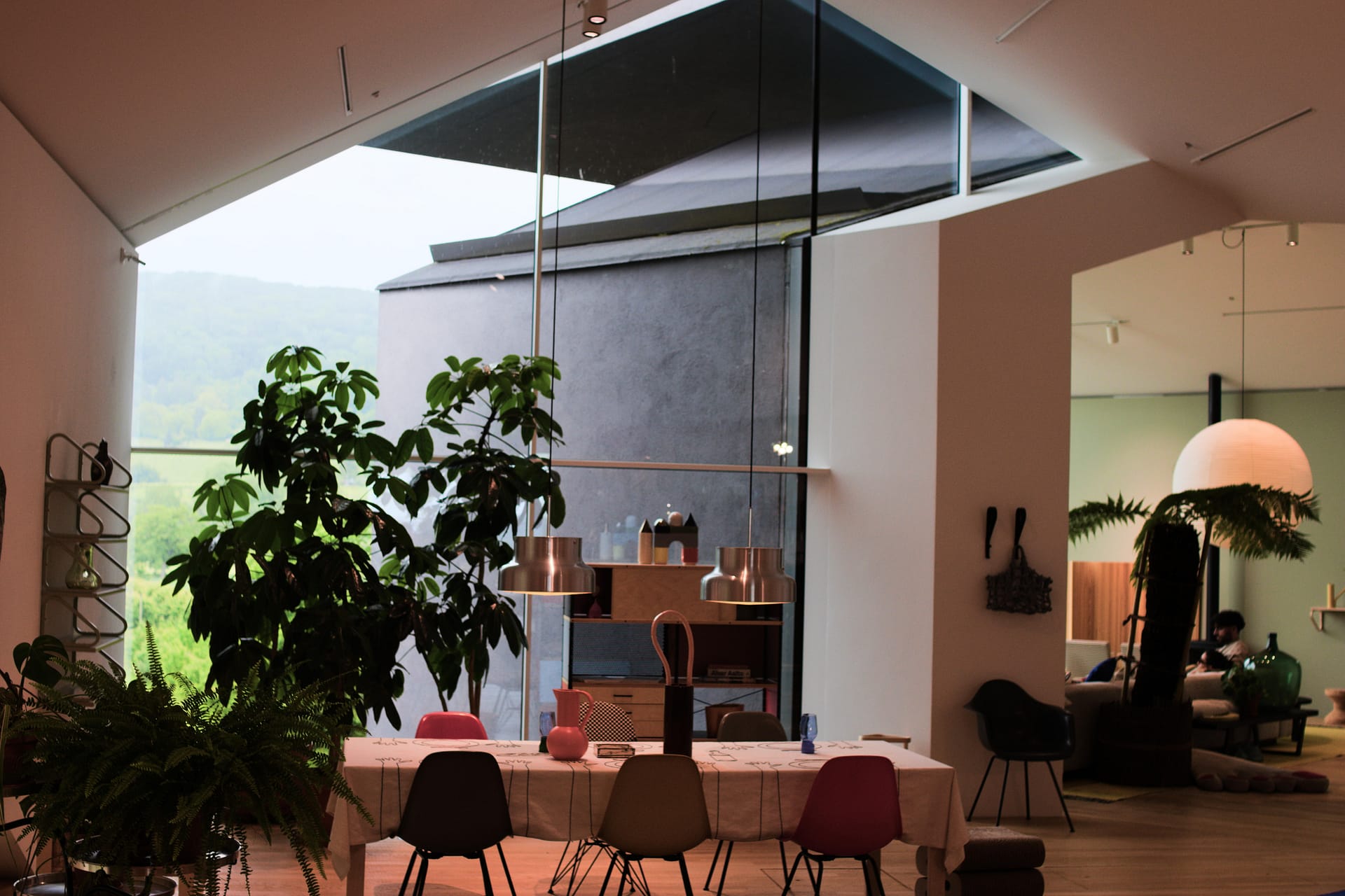 The building designed by Herzog & de Mueron is a museum, open to the public that showcases their wide range of products. Its architecture draws from the basic house form that every child draws – two vertical lines for the walls and two diagonal lines for the roof. This idea of the house becomes the formal language of the building, duplicated, rotated and stacked on each other to form the museum. Where the doors and windows would exist on the child’s drawing, a wall of glass takes its place, opening the views to the surrounding countryside and other famous buildings on Vitra campus.