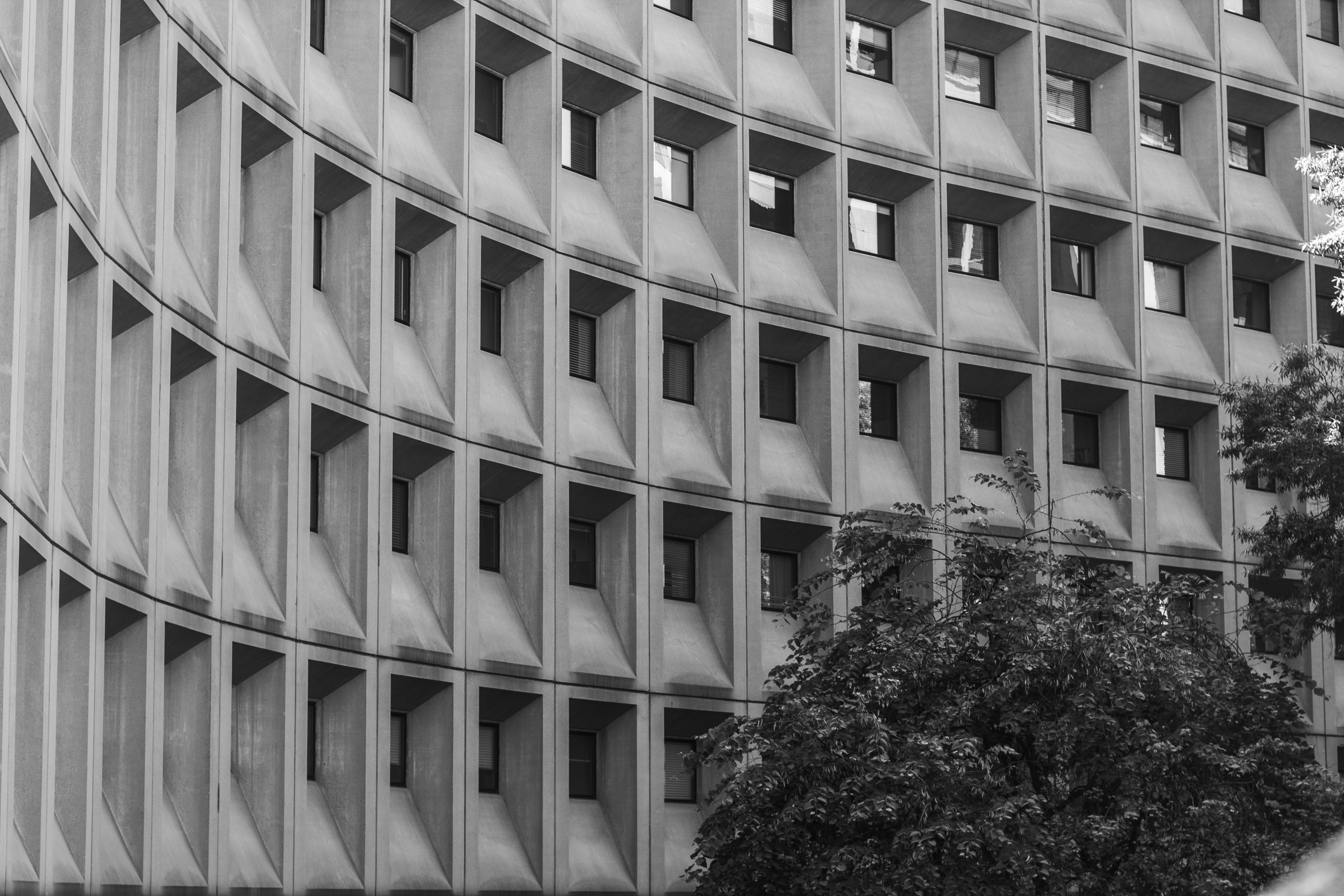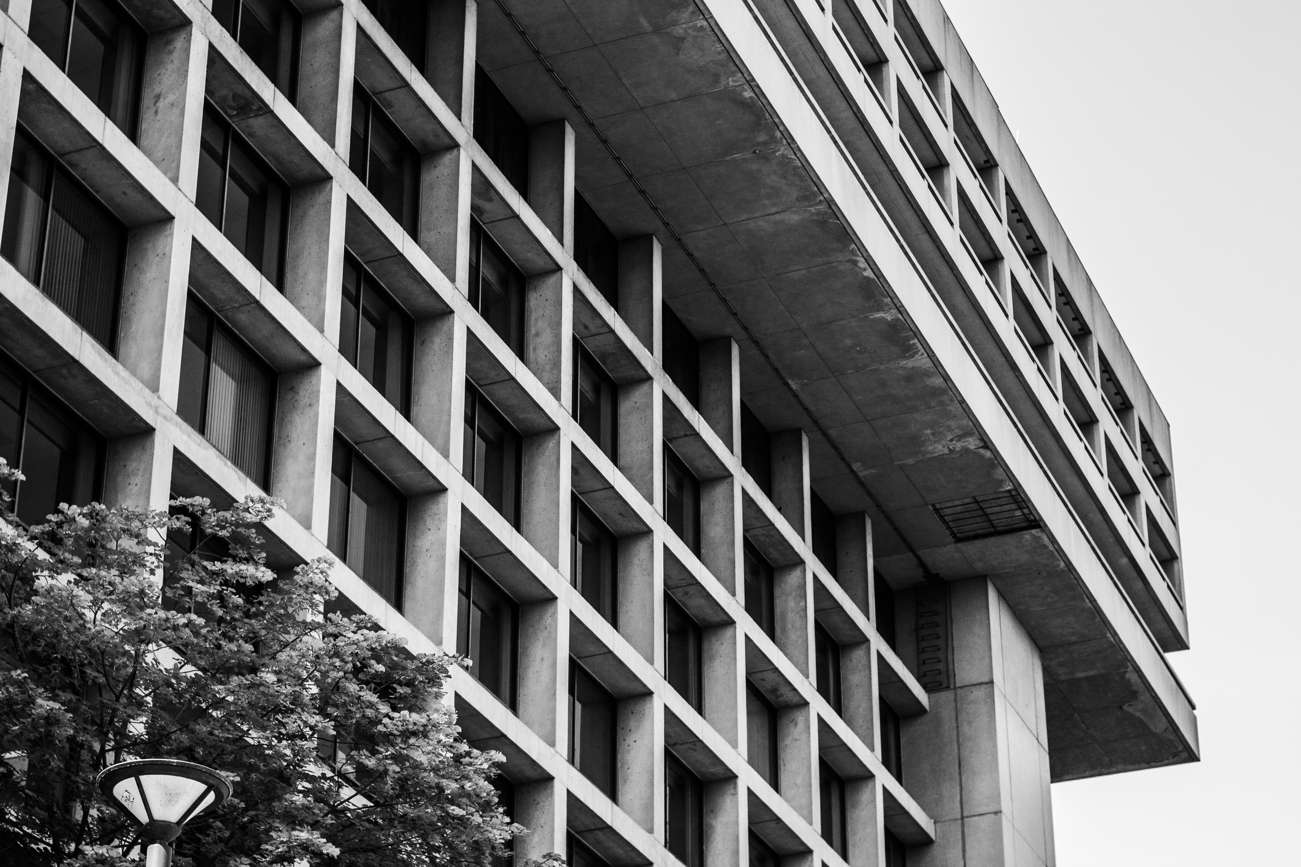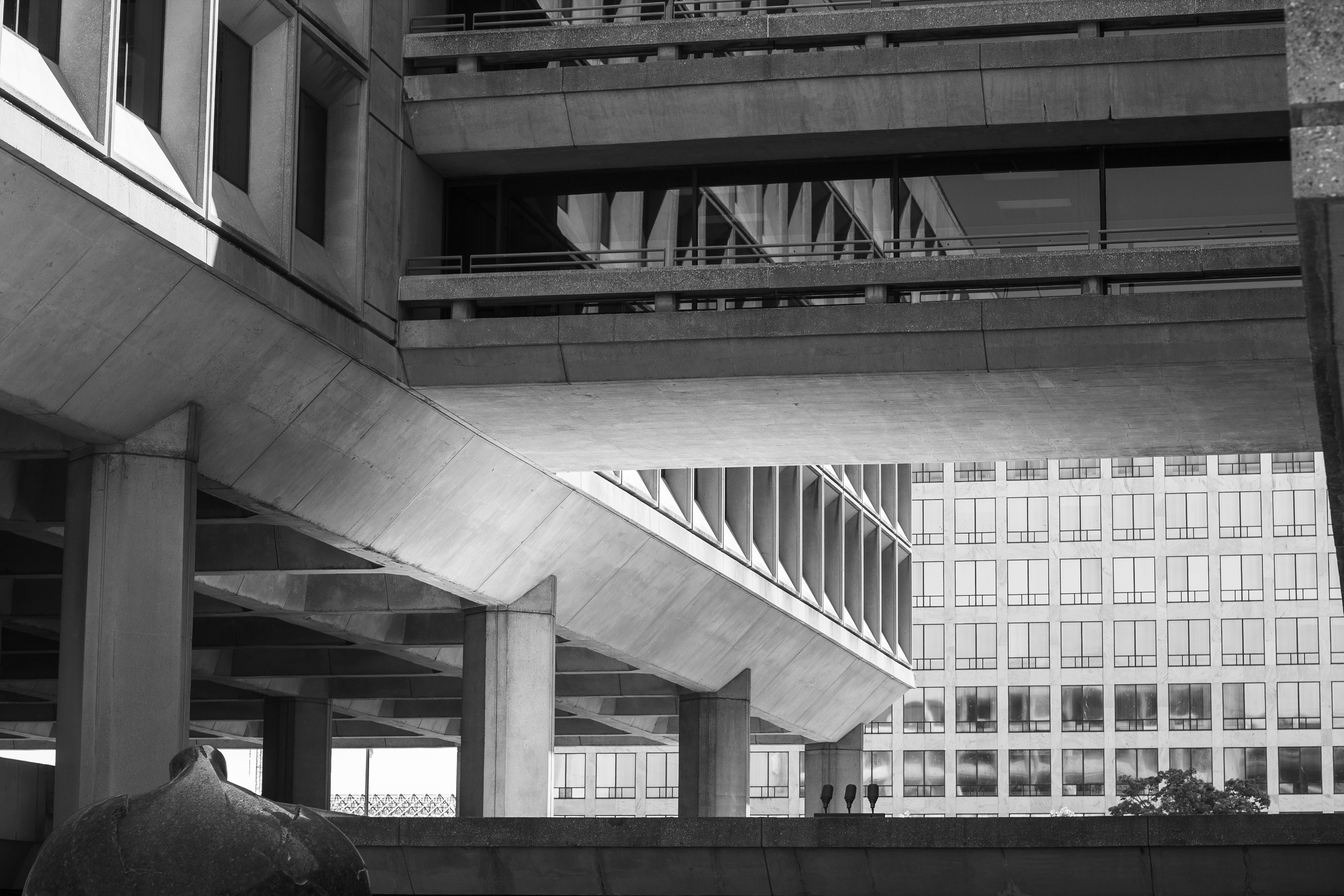 The real beauty of brutalist buildings is realized through photography. Through black and white photography, you can capture those elements that are mentioned above and are easily missed by most people. When looked at in black and white, the display of strong lines and shadows, the depth and contrast between surfaces, and the interplay of voids and masses become immediately apparent. Of course, when you build a building, you want it to do more than just look good and this is where their criticism is deserved. In one of my previous blog posts, I summarized a book on the failures of modern architecture. One of its failures was its dependence on new construction techniques and materials. Reinforced concrete was one of these. It was a new material and its limits were unknown. It was a cost-efficient building method, so it became widely used. Many architects thought that concrete needed little or no maintenance, but it actually needs a lot. Without regular maintenance, they crumble and become plagued by water stains. Because of this, at least in the public’s eye, they were/are scorned.