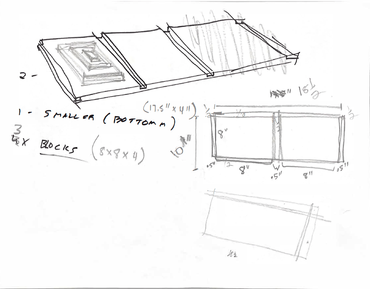 My initial sketches were based on mid-century modern breeze blocks. However, after talking to my friend, I quickly realized that they would be extremely difficult to cast. He helped me come up with a new design that was meant to make it easier to take the formwork off once the concrete cured.
