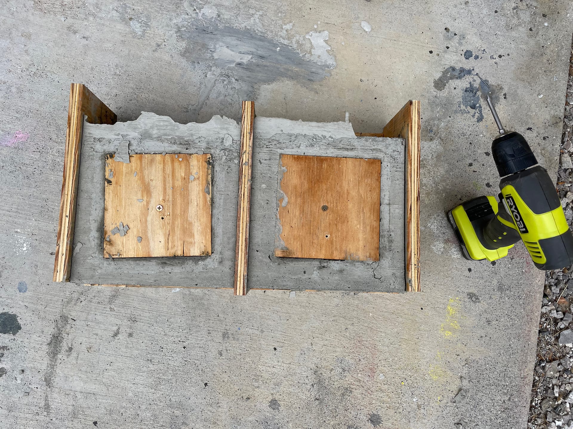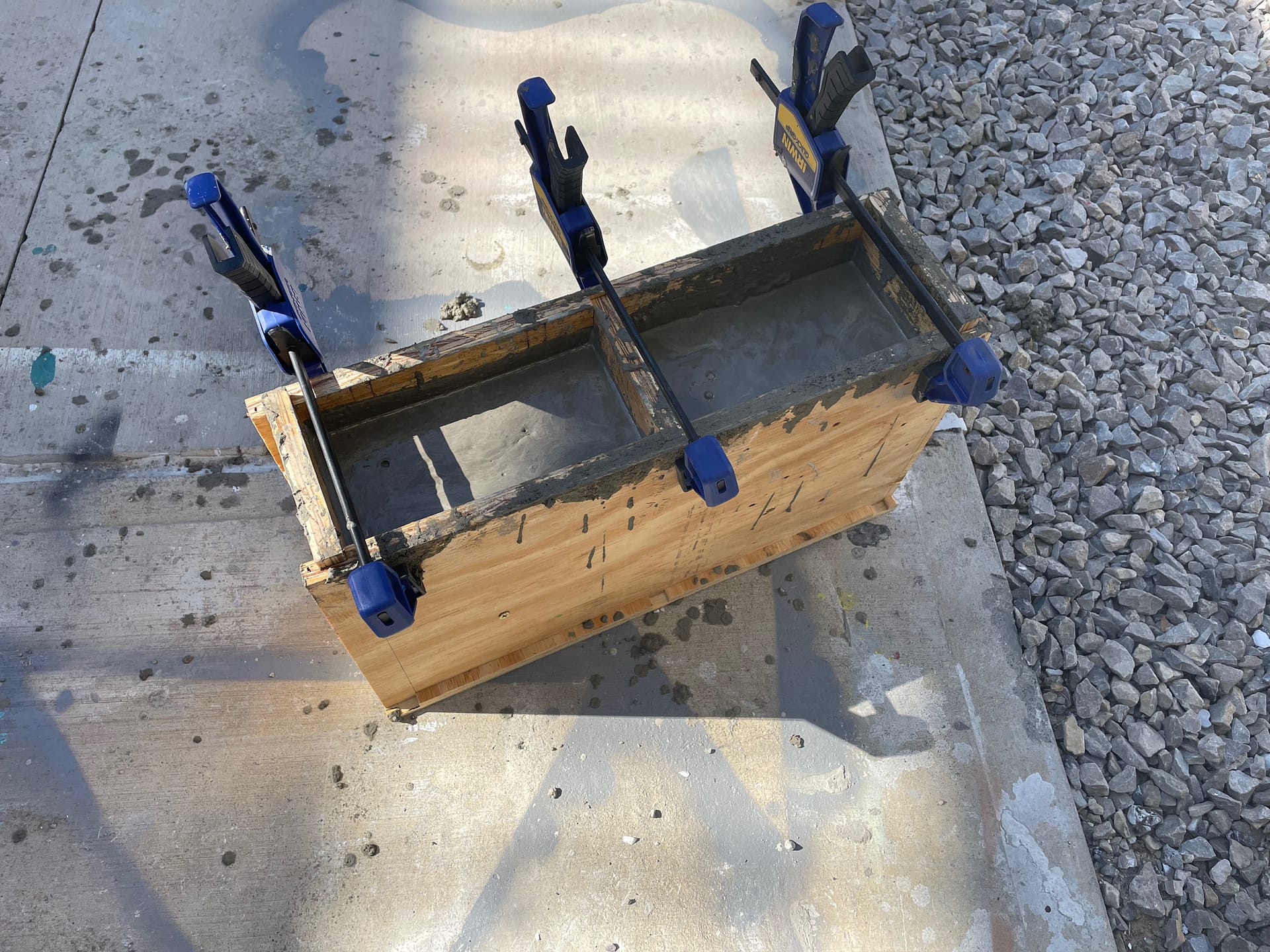 Pouring the concrete started off well. I had two blocks to pour and figured I would use half the bag and half the amount of water to start. However, as I was mixing it, I noticed I couldn’t get the bottom. It was almost like trying to mix water into flour. I was getting nervous that it was drying, so I poured into my mold only to have it get stuck and sit atop on my chicken wire reinforcement. I panicked and pulled it out and continued pouring the concrete. I didn’t know what would happen because with the reinforcement, concrete could easily crack when taking off the formwork. Also, concrete needs to be vibrated while it’s setting to get the air bubbles out. Air bubbles can weaken the concrete. I didn’t have a concrete vibrator, so I shook the mold for a bit. I had no idea what I was doing, or if it was doing anything.