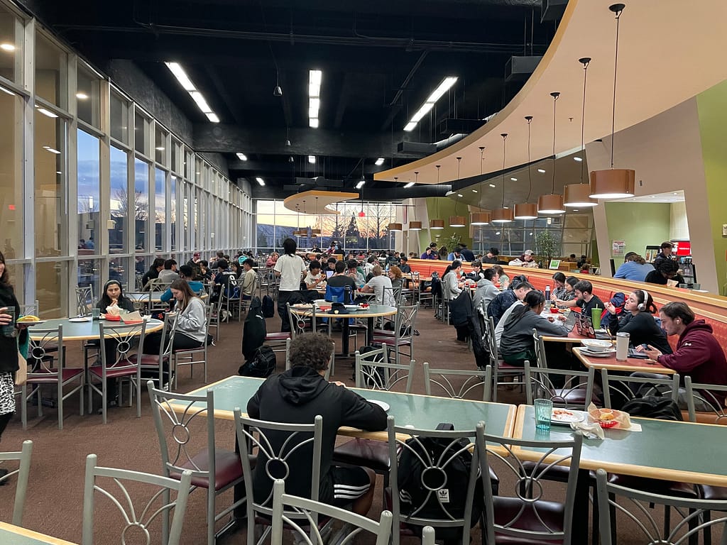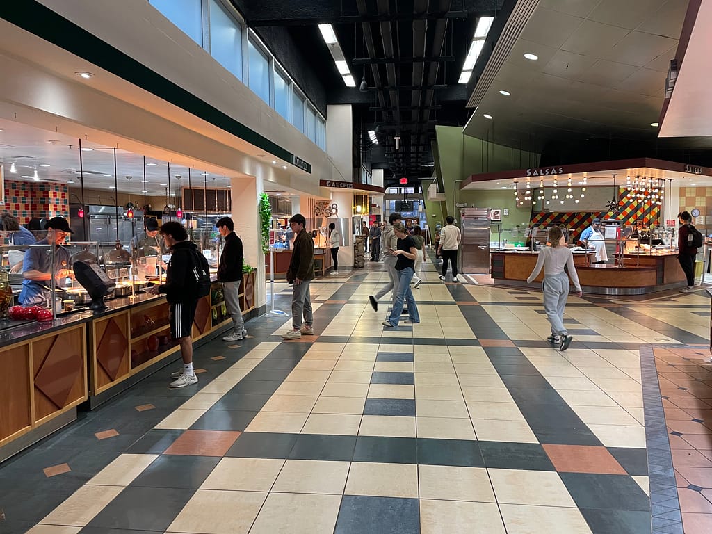 As my time at VT nears its end, I resolved to immerse myself in the renowned dining experience before I graduated. For that to happen, I needed to eat at Dietrick Dining Hall. Also known as D2, Dietrick Dining Hall is one of the largest non-military dining halls in the U.S. (it can hold 1,100 people) and sits centrally amidst the dorms. Built in the brutalist style of the 1970s, it lacks Hokie stone. Instead, you’ll find concrete and glass. Last year, the school attempted to enliven the facade with colorful banners between the exterior pillars. It’s debatable whether or not they improved the building, but I’m sure in their mind, they have.