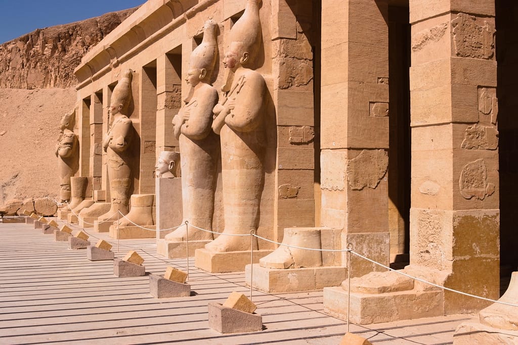 The Mortuary Temple of Queen Hatshepsut is an impressive terraced structure with a monumental ramp, built around 1450 BC. It’s a marvel of ancient Egyptian design and construction techniques, that is, until you realize what we see today is almost a complete reconstruction of what existed. A testament to modern day reconstruction. Unfortunately, over 80% of the temple has been rebuilt and most of the columns are not original.