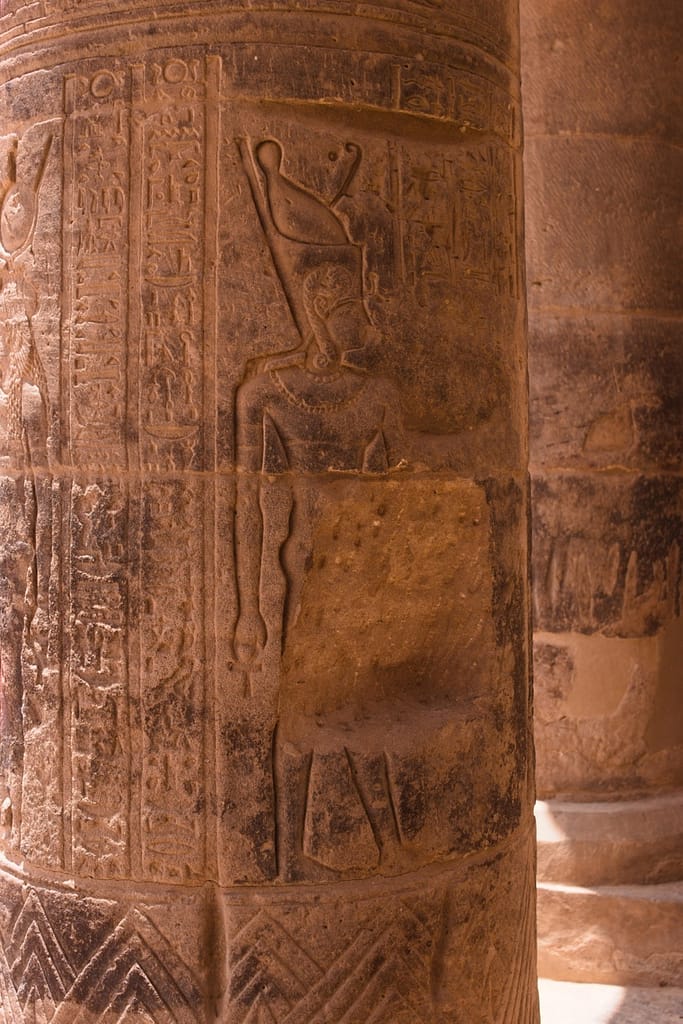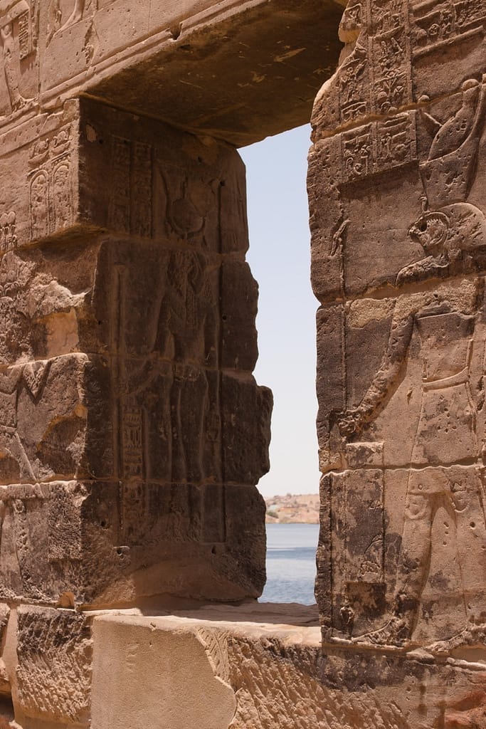 Philae temple was constructed in the 4th century BC. It is only about a 20-minute taxi ride from Aswan, but then a short boat ride is required to reach its current location on Agilkia Island. It was originally located on Philae Island, before the Aswan Dam was built and flooded the area, so its current location does the monument justice. Surrounded by water, situated within the Nile, it is an impressive sight. My New Zealand friend and I had the temple to ourselves. There was hardly anyone else in sight. At 112 degrees, it was too hot, sitting in the uncovered sun for more than a few minutes. The complex is small and didn’t require more than an hour to see it.