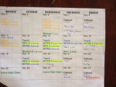 Wednesday was the first time we had the opportunity to observe the Intermediate C class. That went from 9:30 to 11. The students in the intermediate c class are light years away from the students in the Intro and Beg A class. You can talk at normal speed and they can pretty much understand most spoken words. We also completed module 7 which was on lesson planning and had to observe the Into and Beg A class later in the day.