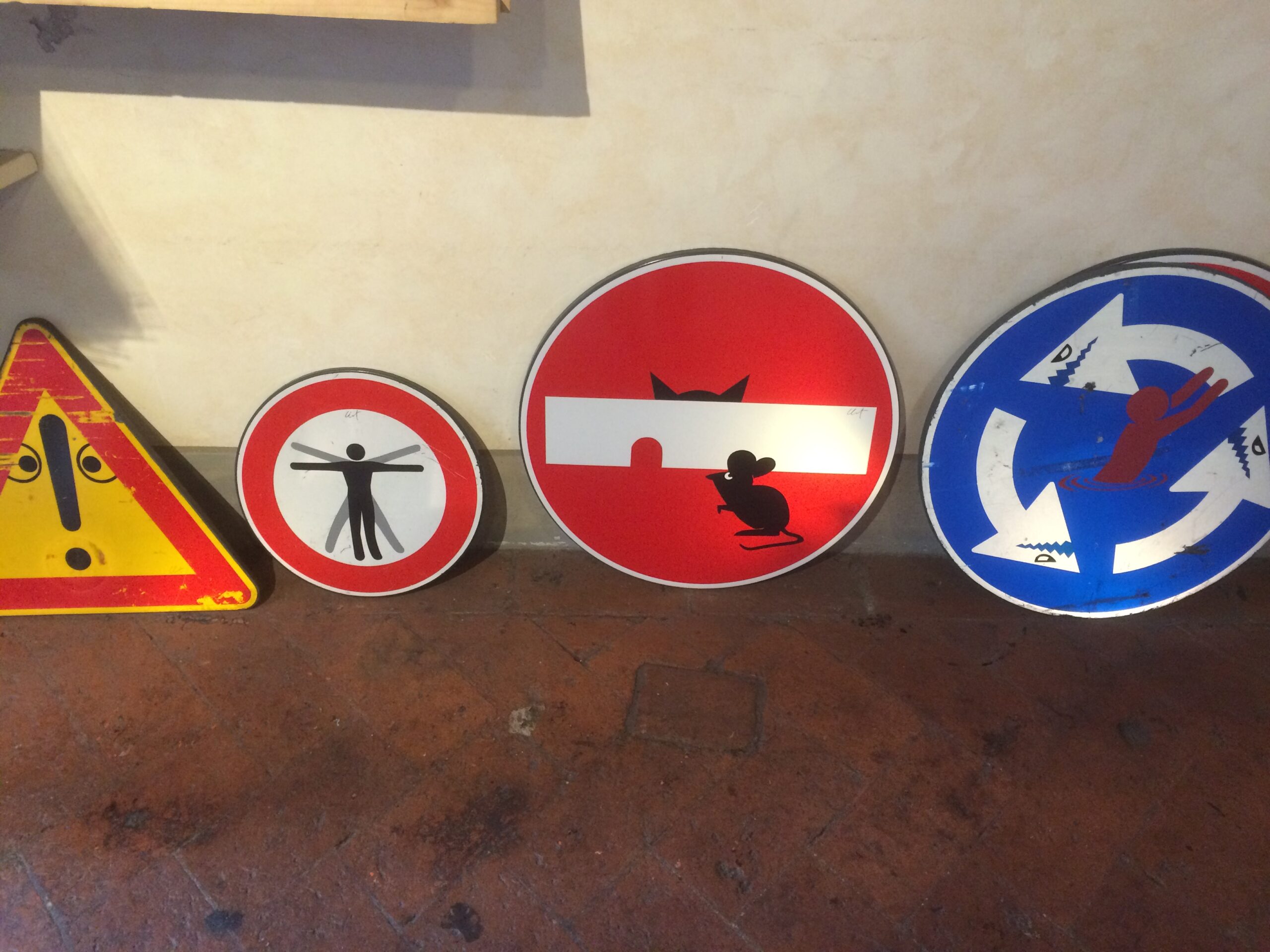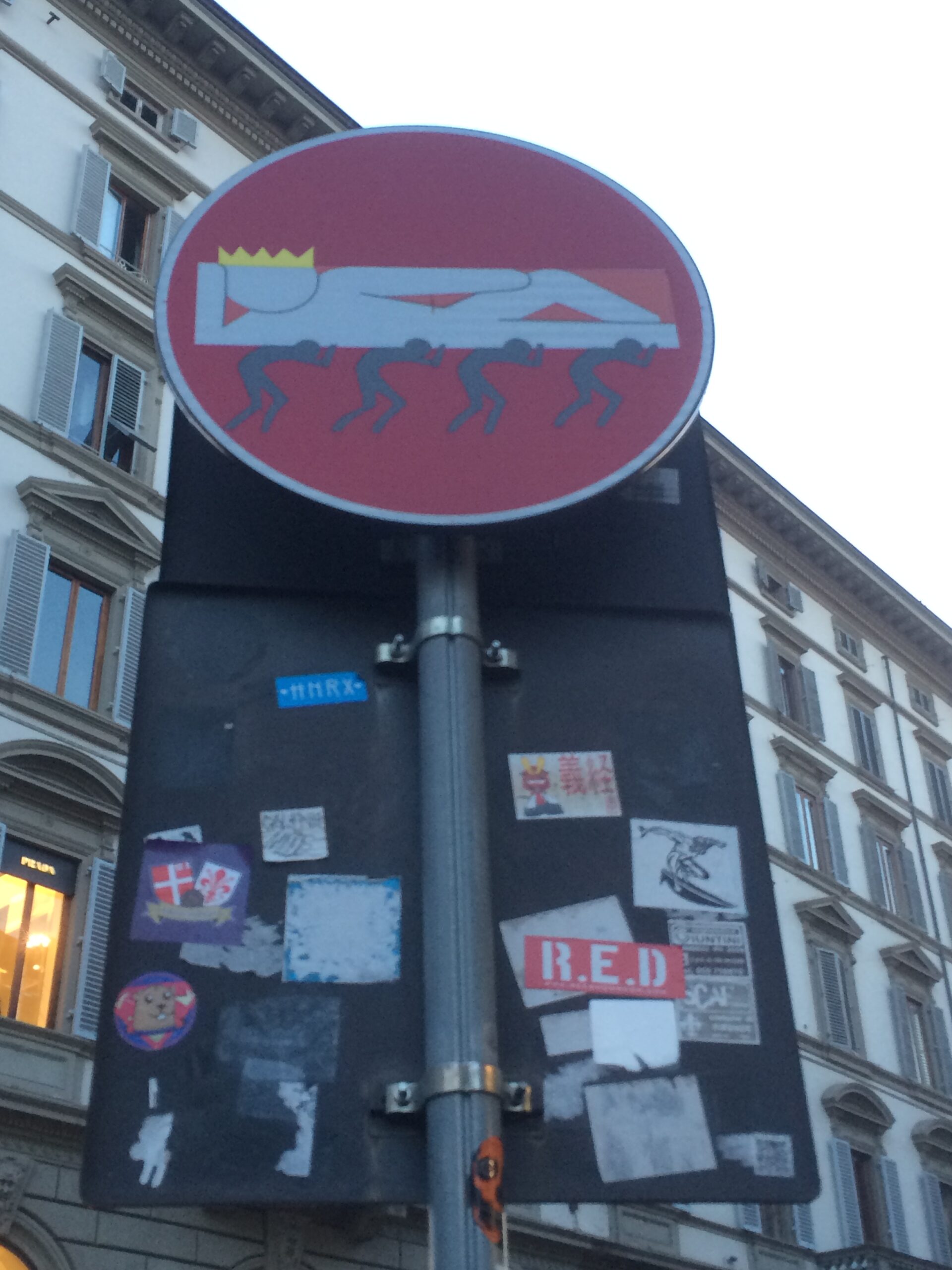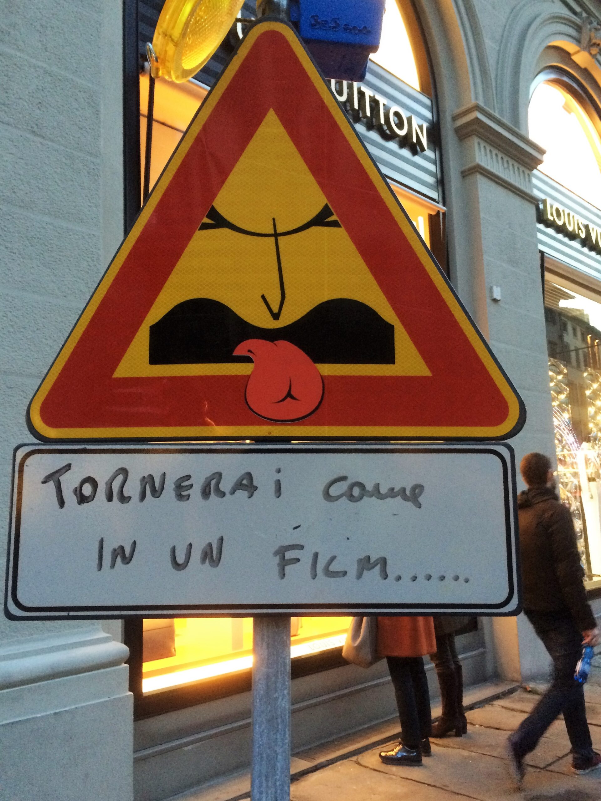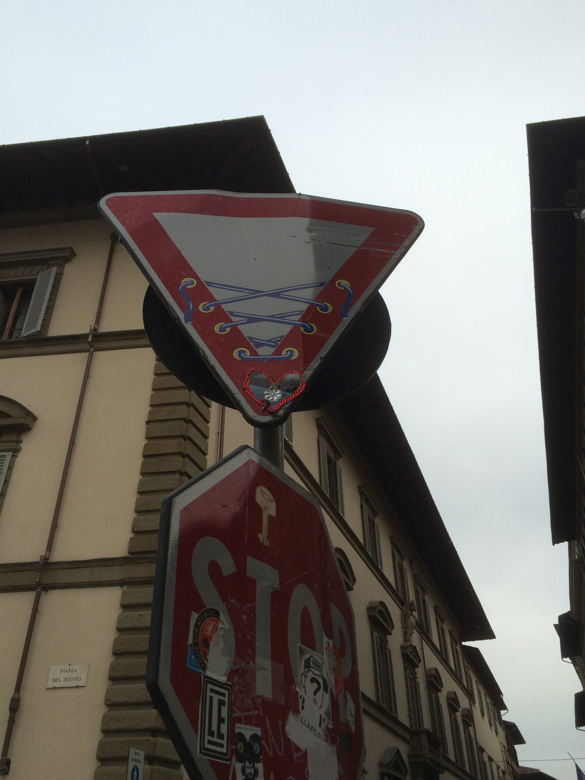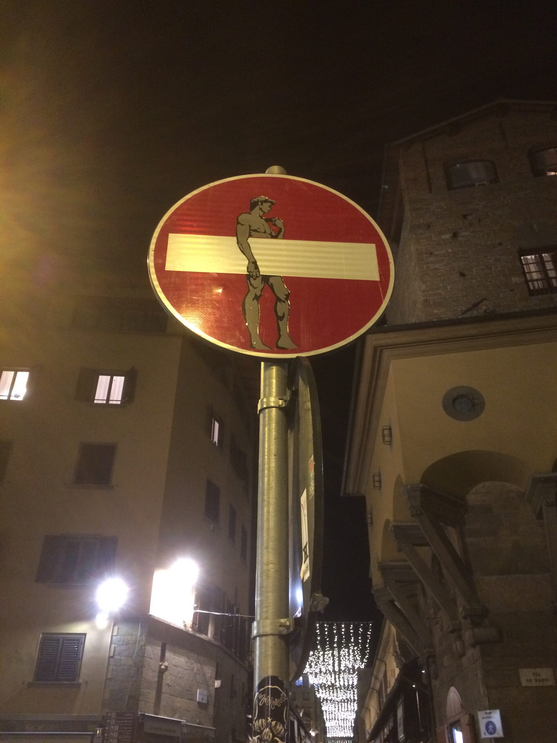 arrived to Florence in the afternoon, hungry and excited. There were two things I wanted to do, the first was get a panini from a panini place considered to be the best in Florence. My friend visited last year and said it was something you had to try, also, everybody I met in Rome that had visited Florence said the same thing, you have to go to this panini place. Since I was hungry, it was only fitting to get a panini there. I wanted to get there before it closed, which was at 3:30, so I only had about an hour after arriving to the hostel; this is one of the reasons why I casually passed the Cathedral. I arrived to the panini place, easily found by the lines of people waiting on either side of the street. I only had to wait about 20 minutes. I arrived to the counter unsure what to get, telling him to make me his favorite sandwich. The panini’s only cost five euro and come with huge portions of delicious meat, cheese and sauce between huge buttery toasted slices of faciattea bread. My first experience with it was so memorable that I decided to go back and get one for dinner. They were cheap and incredibly tasty. I also wanted to try their other sandwiches, they had about 5 or 6 listed as their best made. The second thing I wanted to do was to stop by an artists’ studio and get my sisters a little gift. I didn’t know what his hours would be the upcoming days because of New Years and since it was only the 28th, I figured he would be open. His name is Clet Abraham and he is a painter and sculptor as well as a street artist that manipulates street signs in a playful way. He places stickers on them changing what they look like. Throughout the city you can find his work on various signs and spotting them was fun to do while walking around.