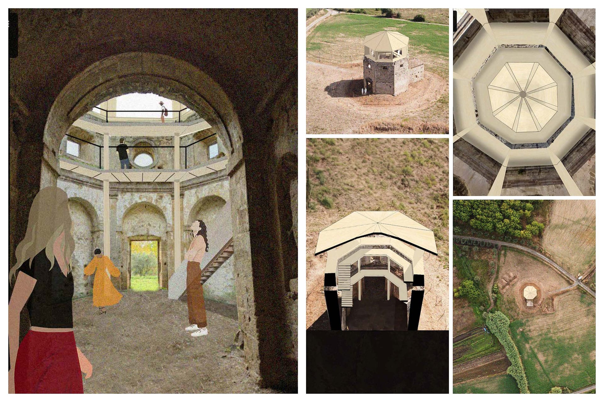 My proposal for the Chapel suggests minimal interventions. The goal is to preserve the chapel’s ruinous state, while transforming it in to an observation post. A wooden octagonal roof and multilevel walkways, respect the original structure, creating an immersive experience. Pilgrims can appreciate the chapel from new vantage points, fostering a deeper connection with the surroundings.