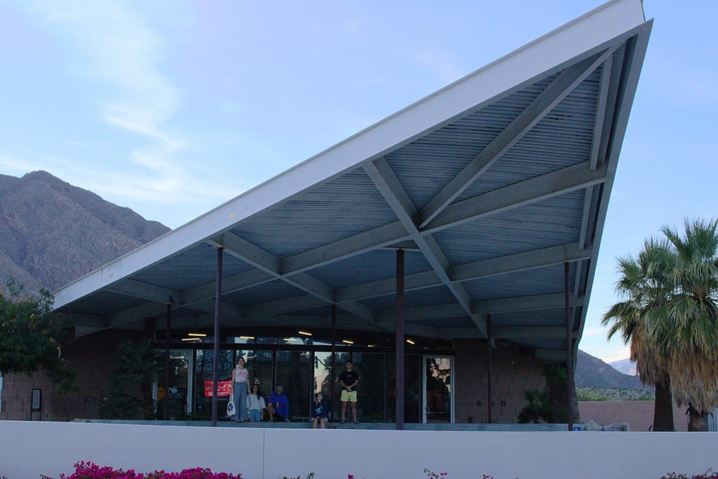 - Palm Springs Visitor Center. It was the second architectural stop we made after the Elvis honeymoon house. Originally built in 1965 as a gas station, the building is best known for its soaring, wing-like roof, which architects Albert Frey and Robson Chambers called a “hyperbolic paraboloid.” The canopy stretches nearly 95 feet beyond the front door and reminded me of one of my friends from architecture school’s tennis pavilion project that had a similar design (I sent a picture to her). It was filled with great info about Palm Springs, the architecture, and fun souvenirs. I bought a Modernism Week poster from 2025. It had a better design than this year’s.