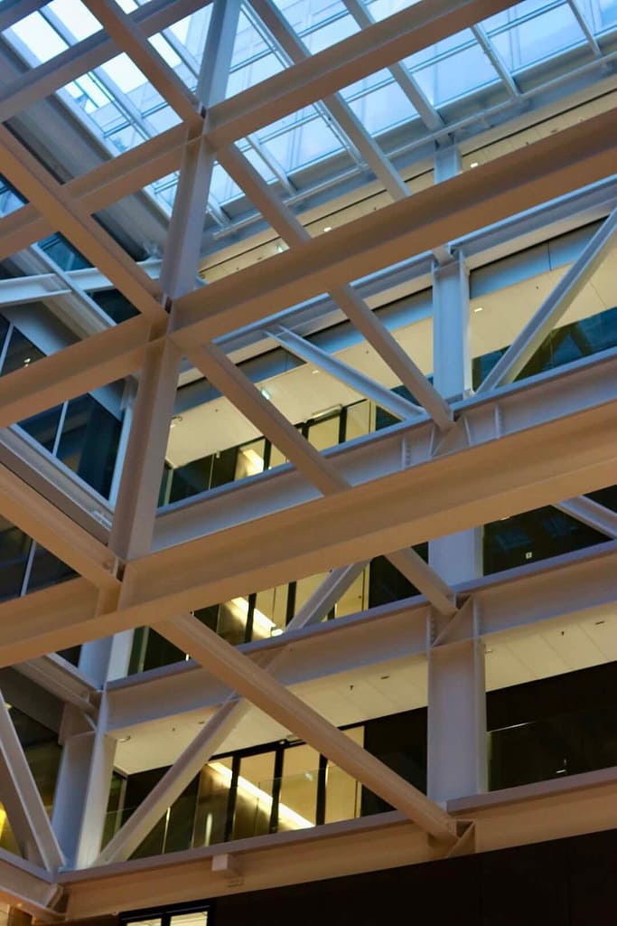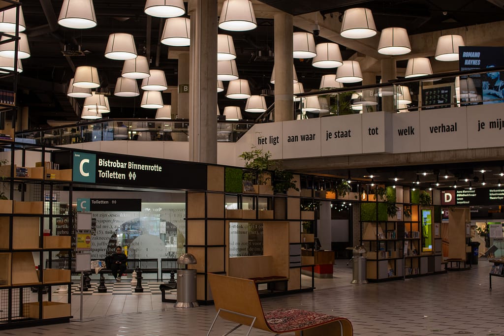 Across from Market Hall is Rotterdam’s Central Library. Completed in 1983 by Dutch architect Van den Broek, it is a ziggurat-like terraced building with eye-catching brightly painted yellow pipes and a central waterfall-like glass structure. Inside, there is a central circulation atrium crisscrossed with escalators and well-lit spaces. I didn’t know what it was when I first saw it. It wasn’t on my list, but I was enthralled by to the funky looking yellow tubes on the exterior and decided to check it out. I think the Dutch students were in the process of studying for their finals because it was packed.