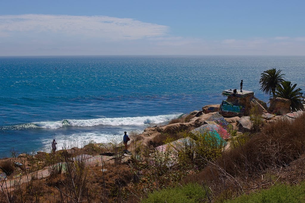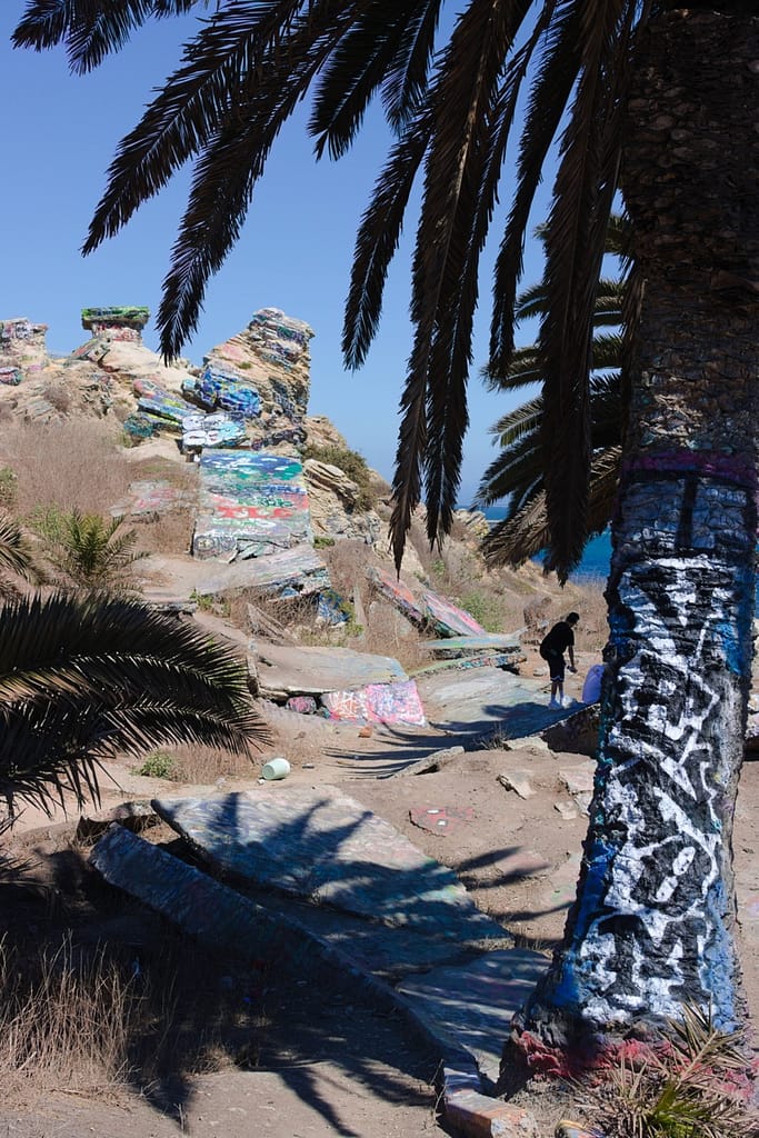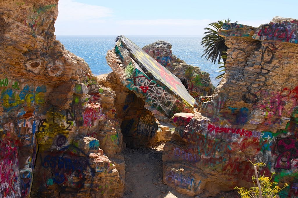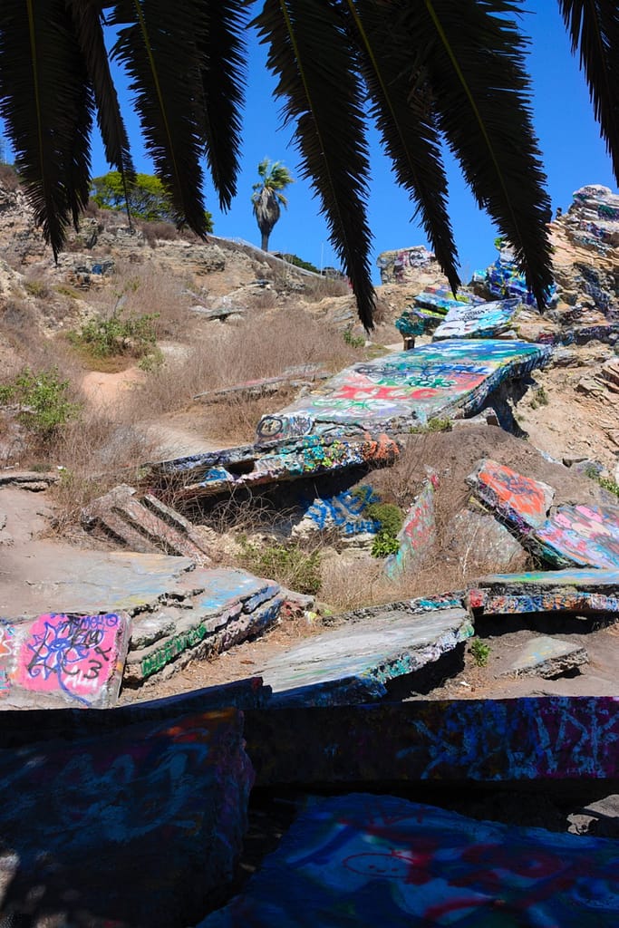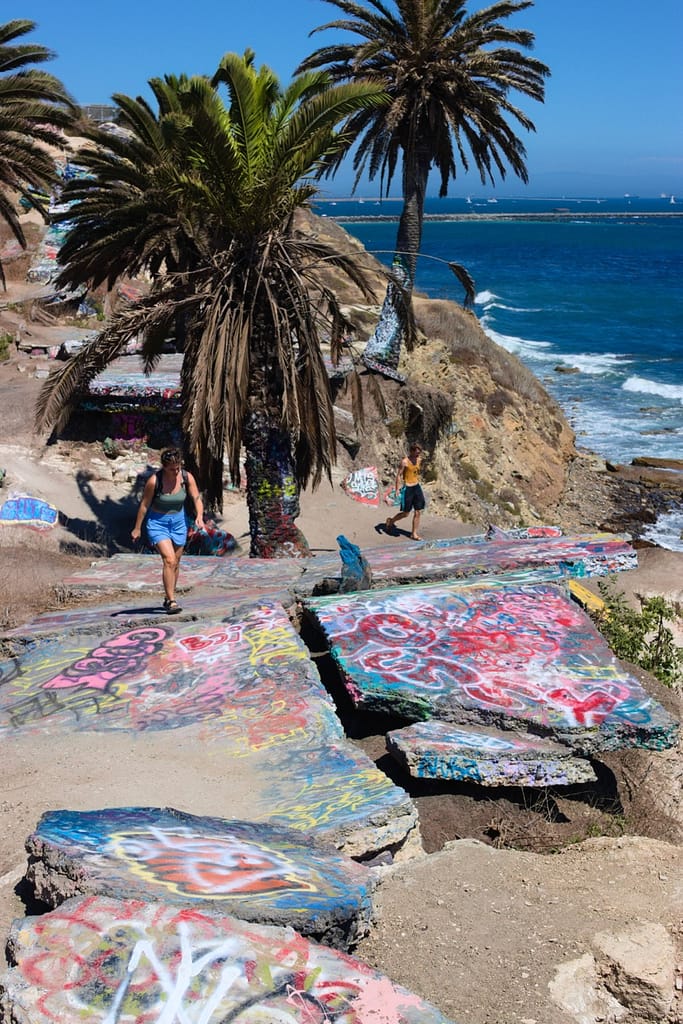 Initially not in our trip. At the planning phase I discounted the Sunken City because it didn’t look like much, and it wasn’t anywhere near where we were going. However, we ended up nearby on our way to a beach and I’m glad we went because it was unexpectedly beautiful. It is the remains of a 1920s neighborhood that slid into the ocean after a landslide. The ruins are tilted sidewalks, broken foundations, and graffiti-covered fragments. It sits on a bluff next to the ocean, the brightly colored graffiti adds a touch of unexpected color to a natural landscape palette.
