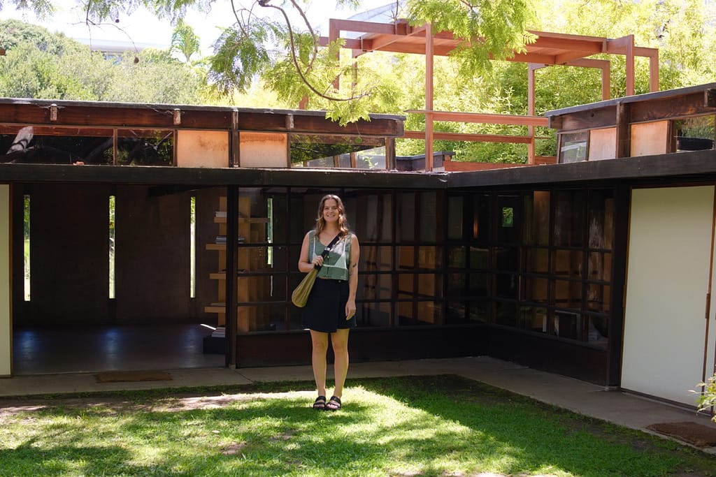 Frank Lloyd Wright’s 1921 design for Aline Barnsdall combines Mayan Revival motifs with Wright’s Prairie style. It’s also LA’s first UNESCO World Heritage site and the first Frank Lloyd Wright House I have visited. It was absolutely amazing to experience. Unfortunately, we couldn’t tour the central courtyard area because of the heat. Here is the guide to get a more in depth look at the house.