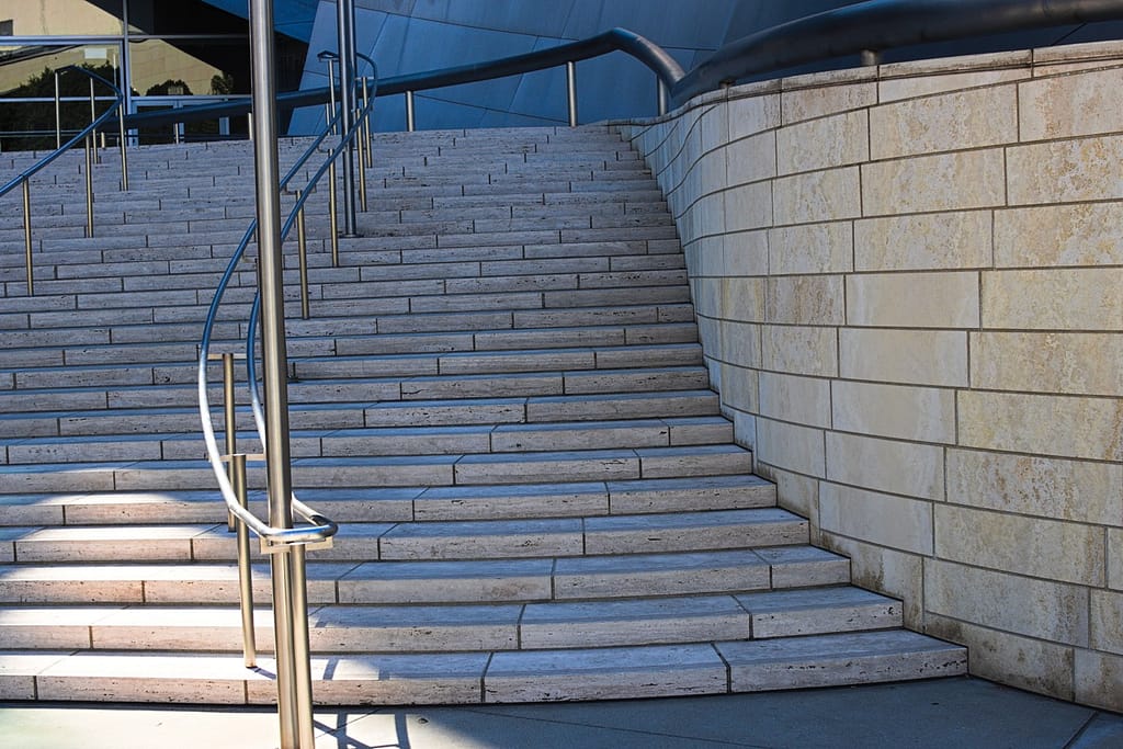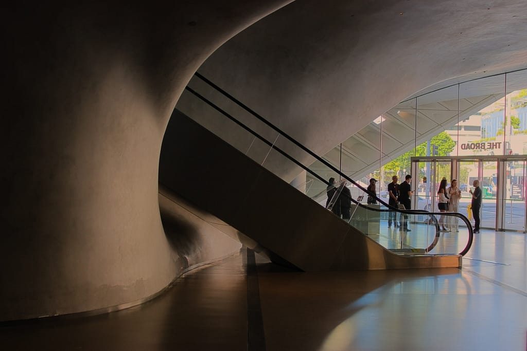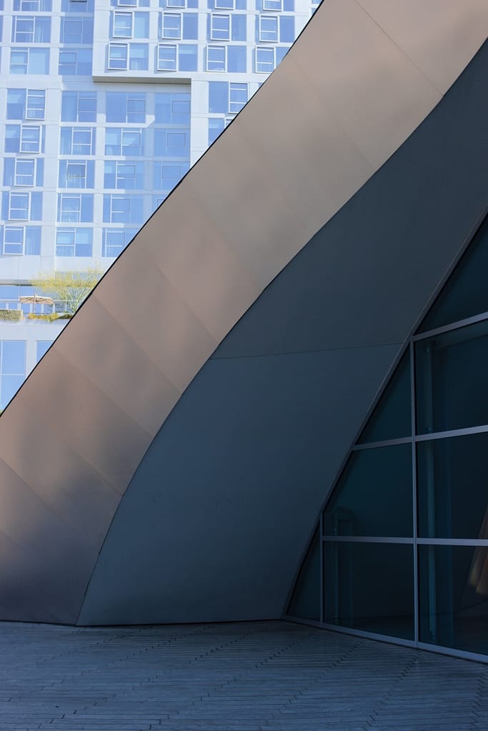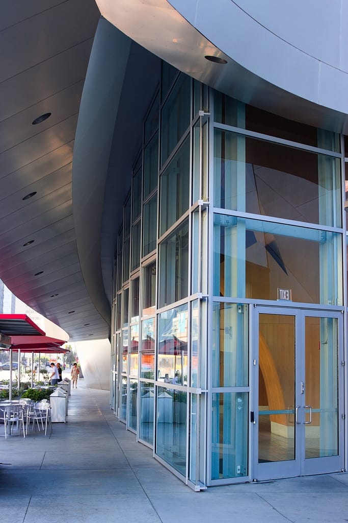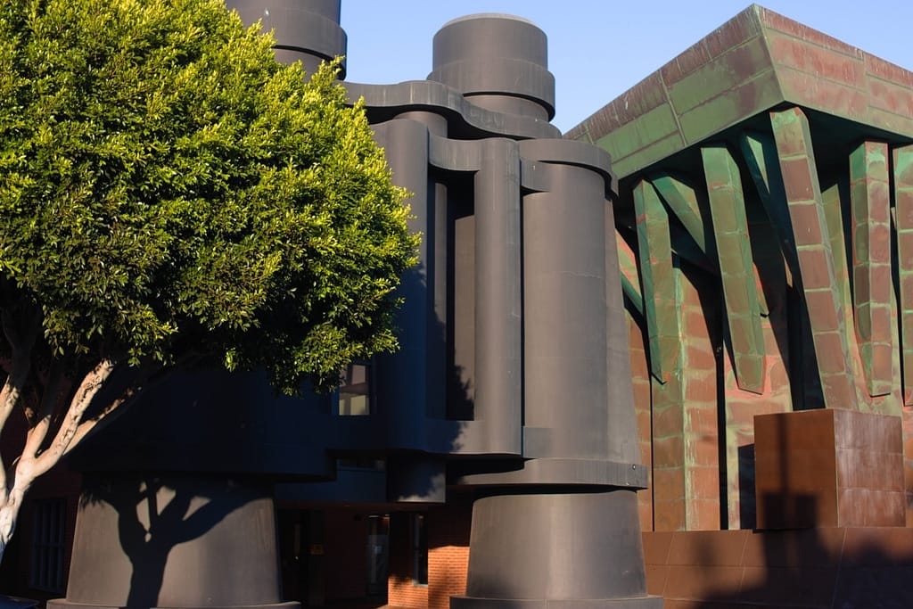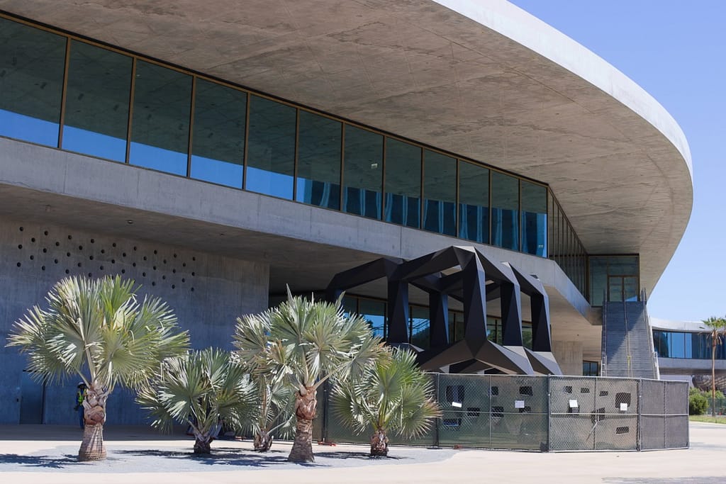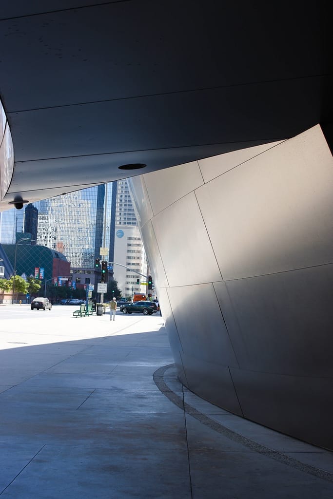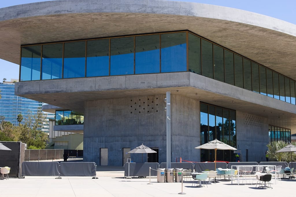 Opened in 2015, Diller Scofidio + Renfro’s Broad Museum is wrapped in a porous honeycomb “veil” that filters light into the galleries. It sits right next to Walt Disney Concert Hall and compliments it nicely.