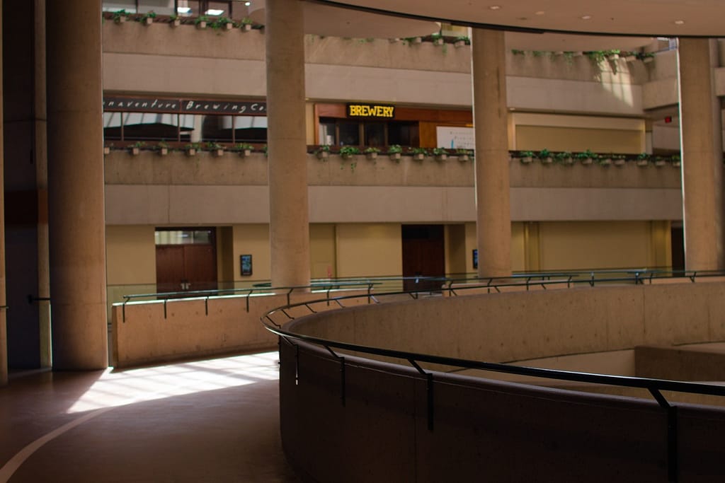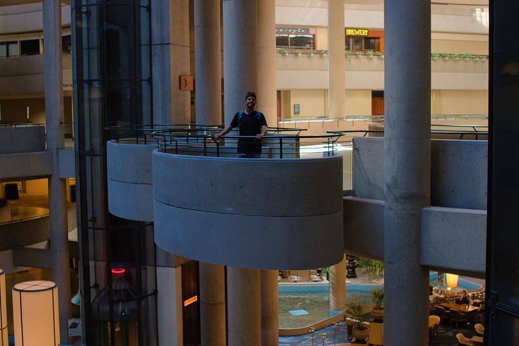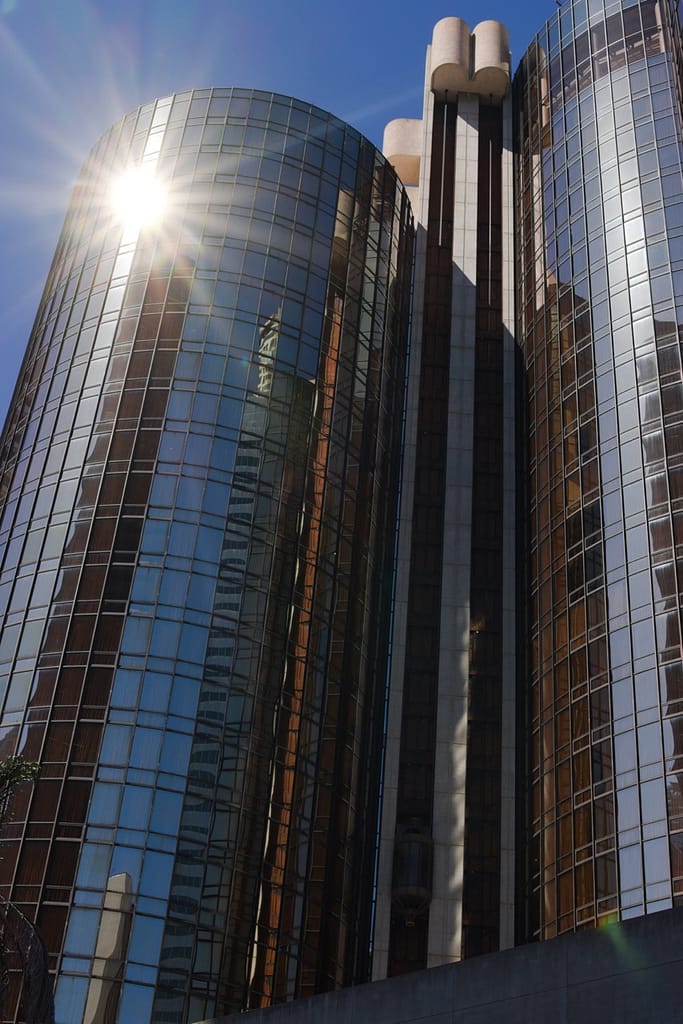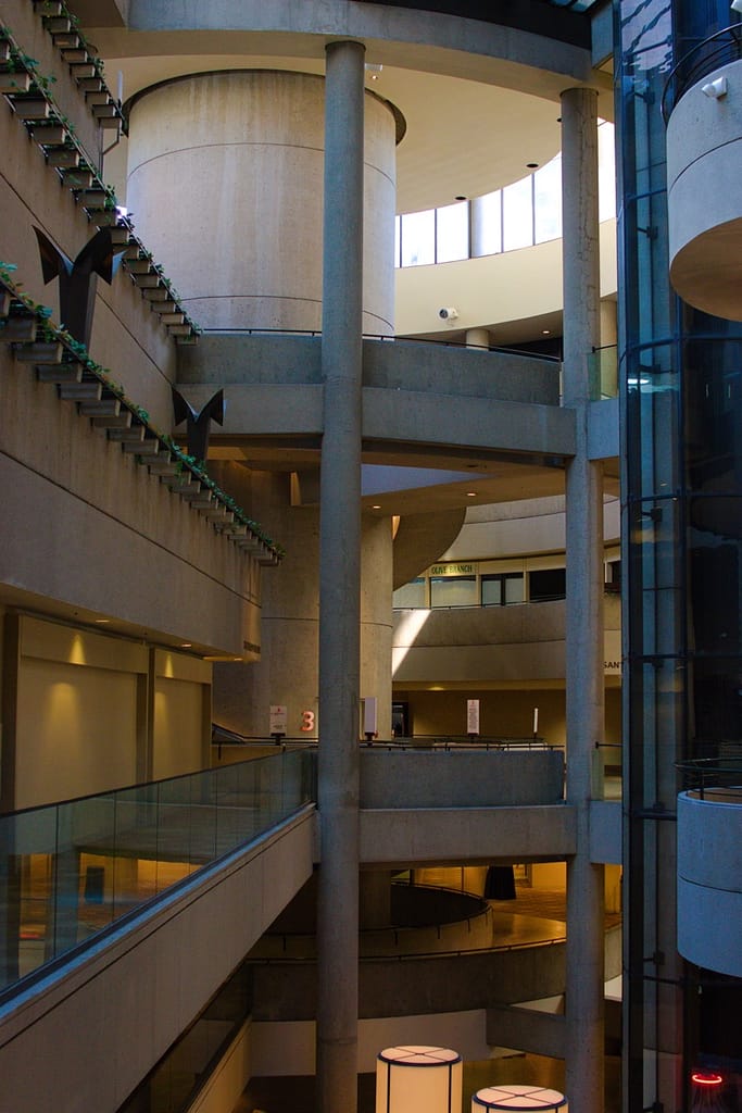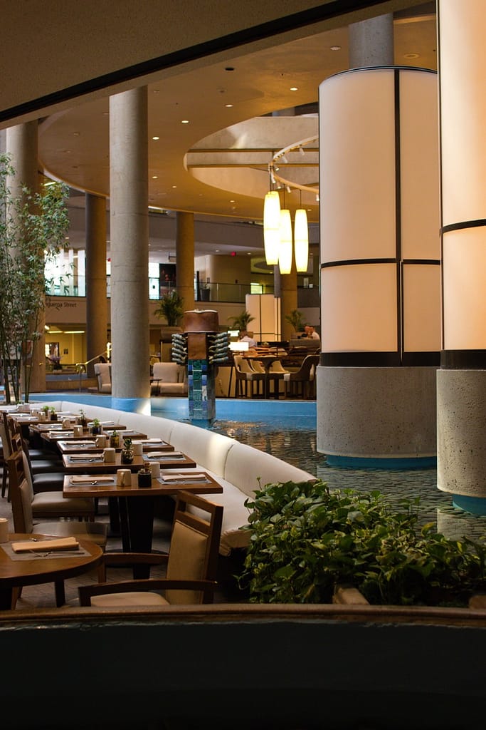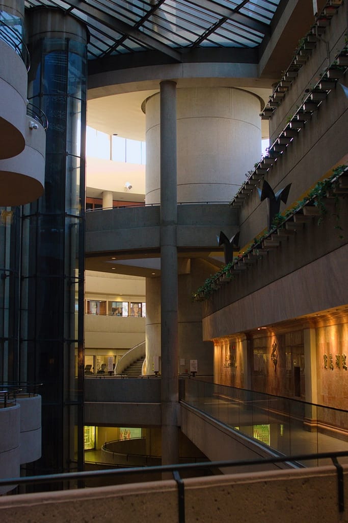 Designed by John Portman (1976), this mirrored-glass megastructure is pure late-modern hotel architecture. Its cylindrical towers, interior skybridges, and revolving rooftop lounge capture the futuristic ambitions of 1970s LA. John Portman is renowned for revolutionizing hotel lobby design by creating the modern soaring atrium. The Bonaventure hotel was astonishing. I wish I could have seen it in its glory when it was first constructed, filled with hotelgoers and full stores and restaurants. When we were there, it looked like shops and restaurants that circled the perimeter of the atrium had been closed for decades.