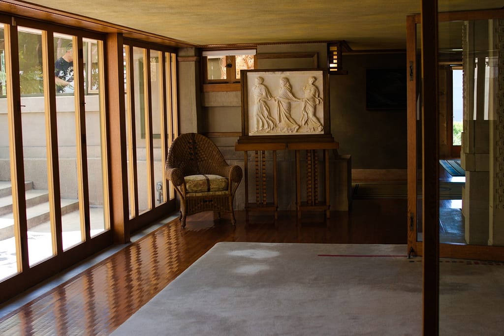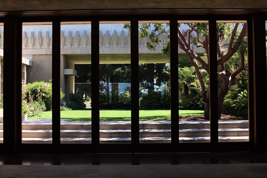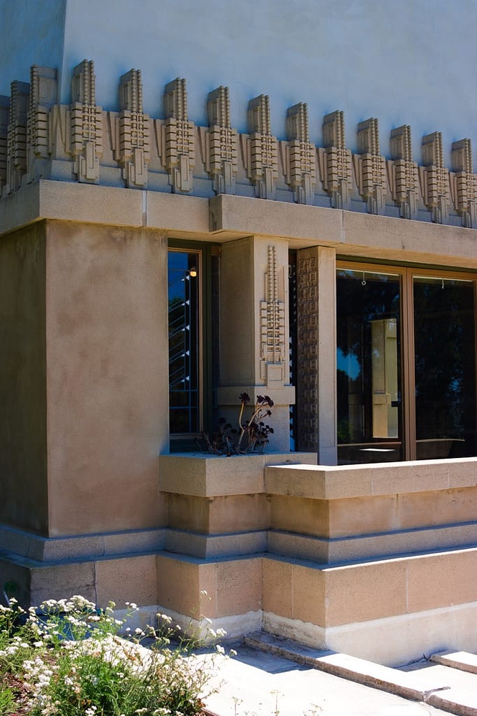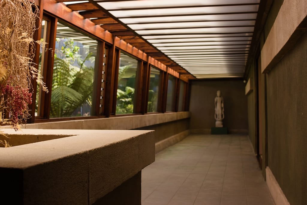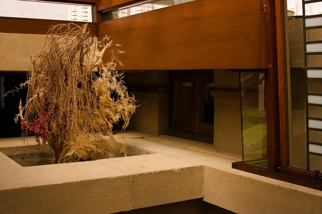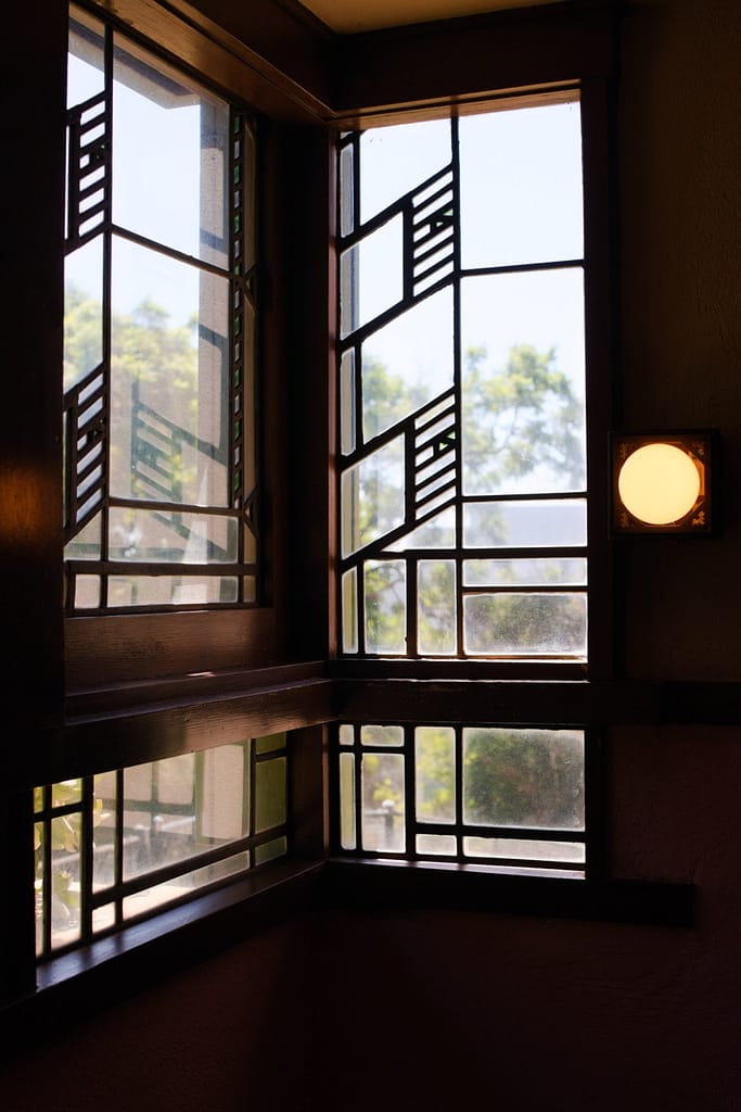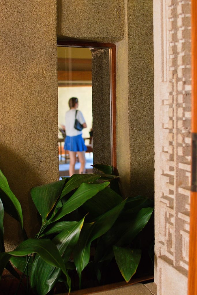 Aline Barnsdall left the Hollyhock House after a few months. She was unhappy with the house’s layout (which is surprising considering she and he went back and forth over the plans), the lack of ventilation and leaking that led to mildew and buckling floors. I believed she also complained about it being dark and when I was there on a very sunny L.A. day, the central living space did have a darkness to it.