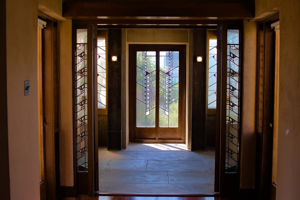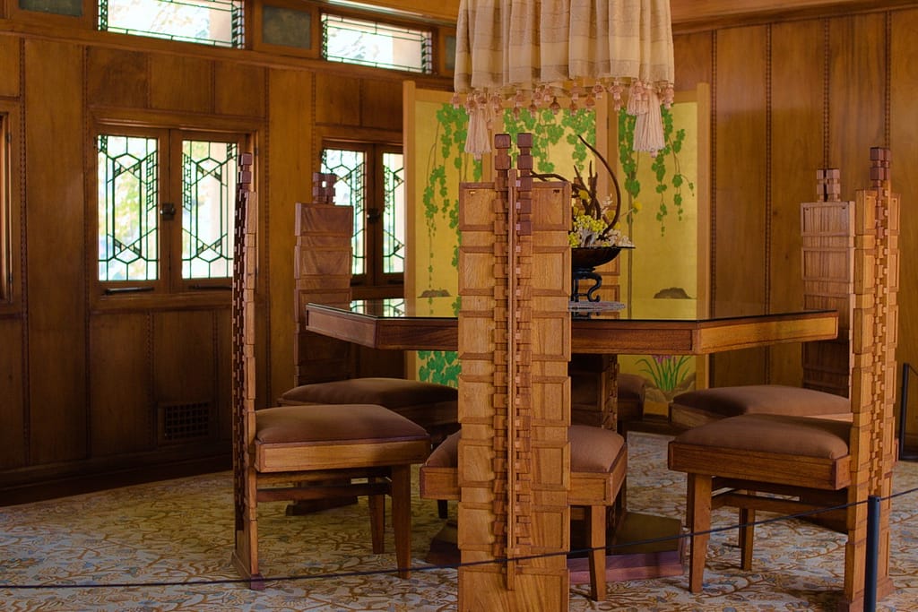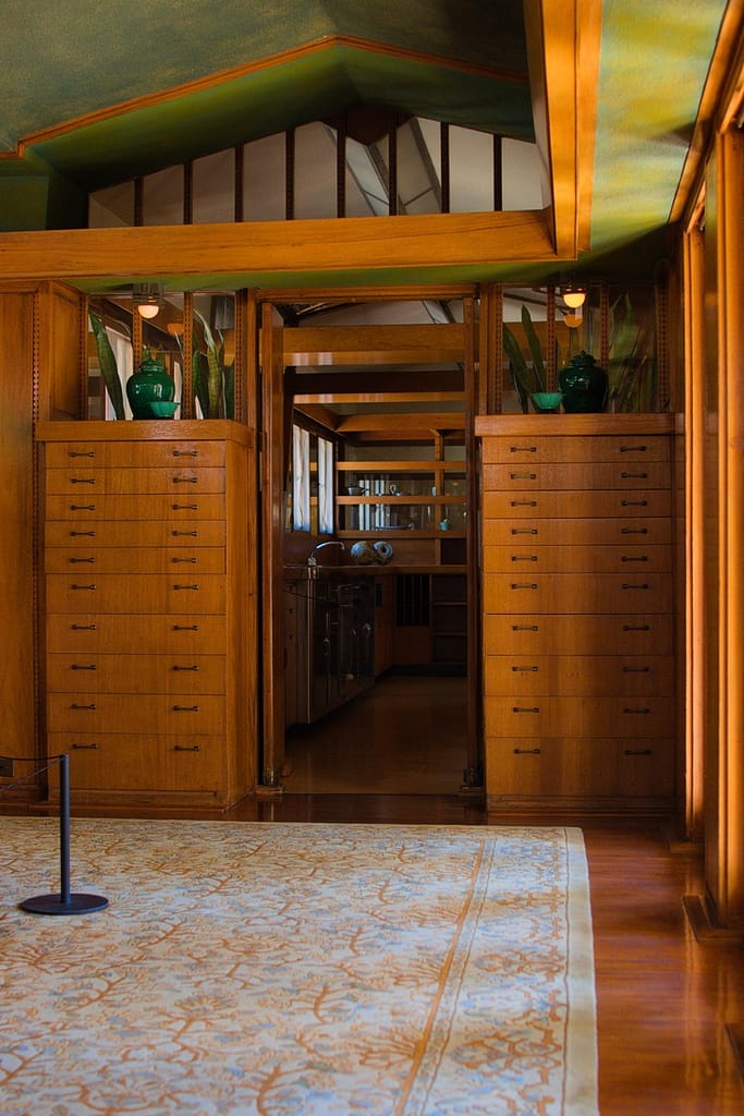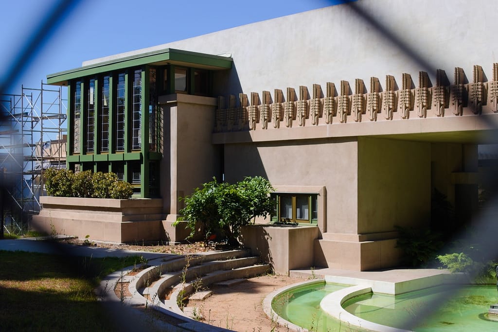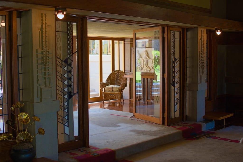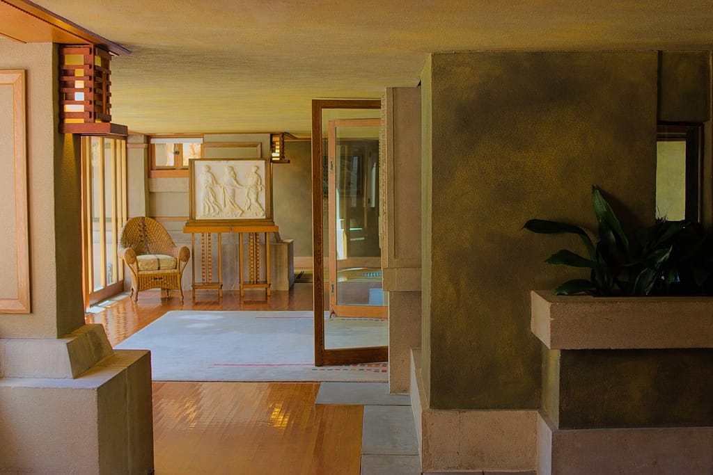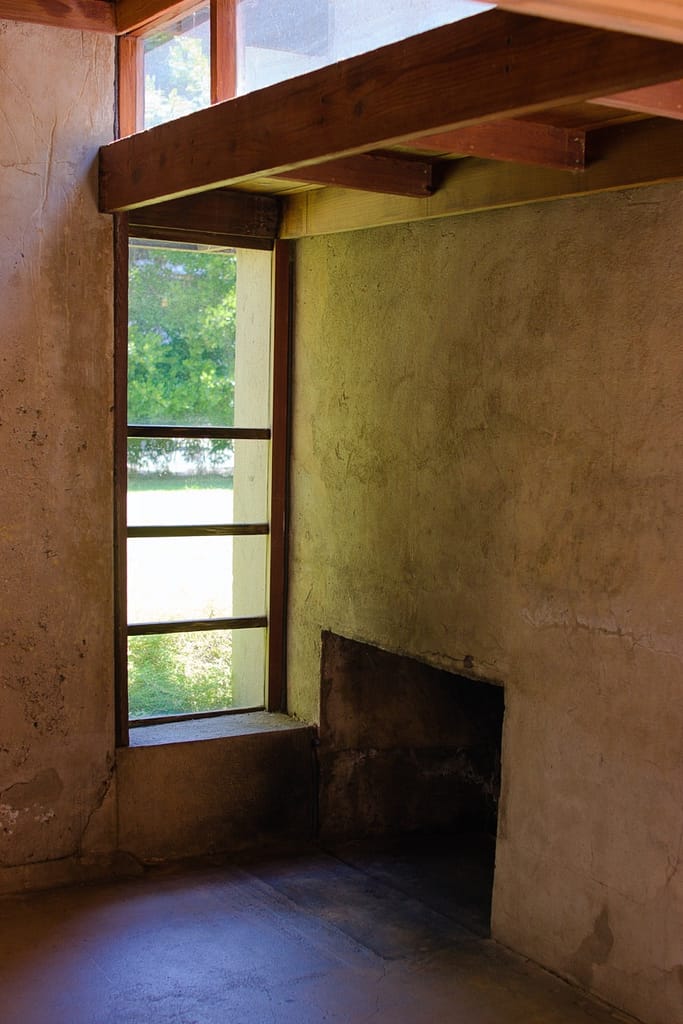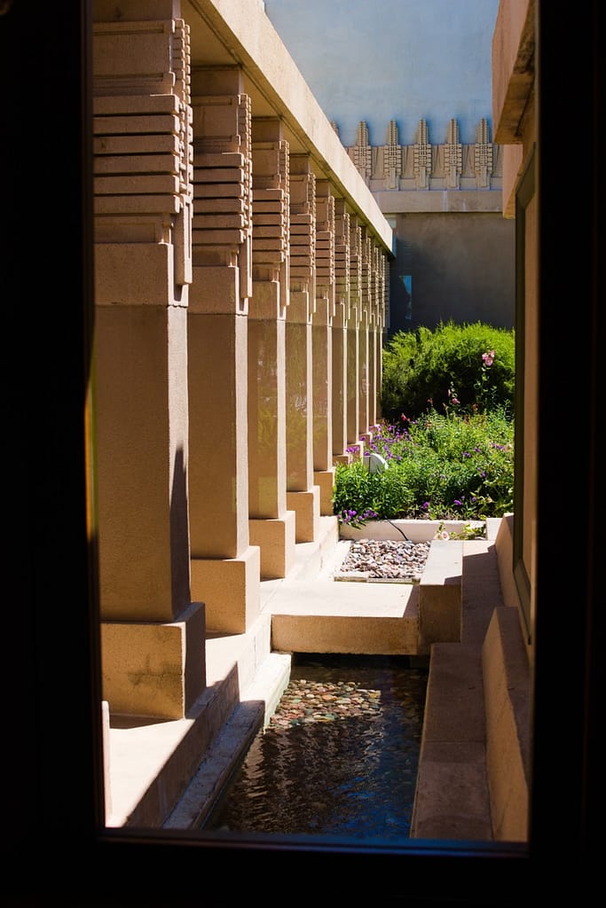 Aline Barnsdall left the Hollyhock House after a few months. She was unhappy with the house’s layout (which is surprising considering she and he went back and forth over the plans), the lack of ventilation and leaking that led to mildew and buckling floors. I believed she also complained about it being dark and when I was there on a very sunny L.A. day, the central living space did have a darkness to it.
