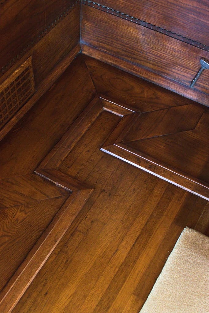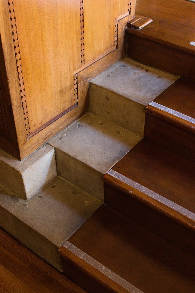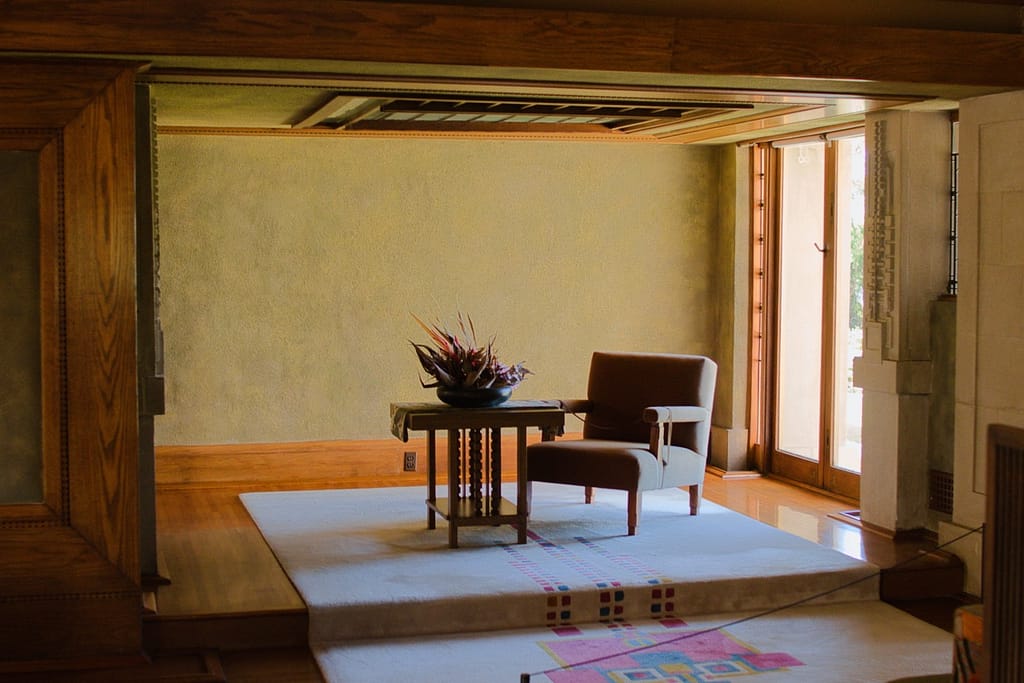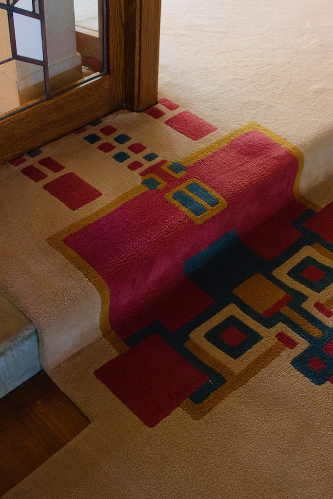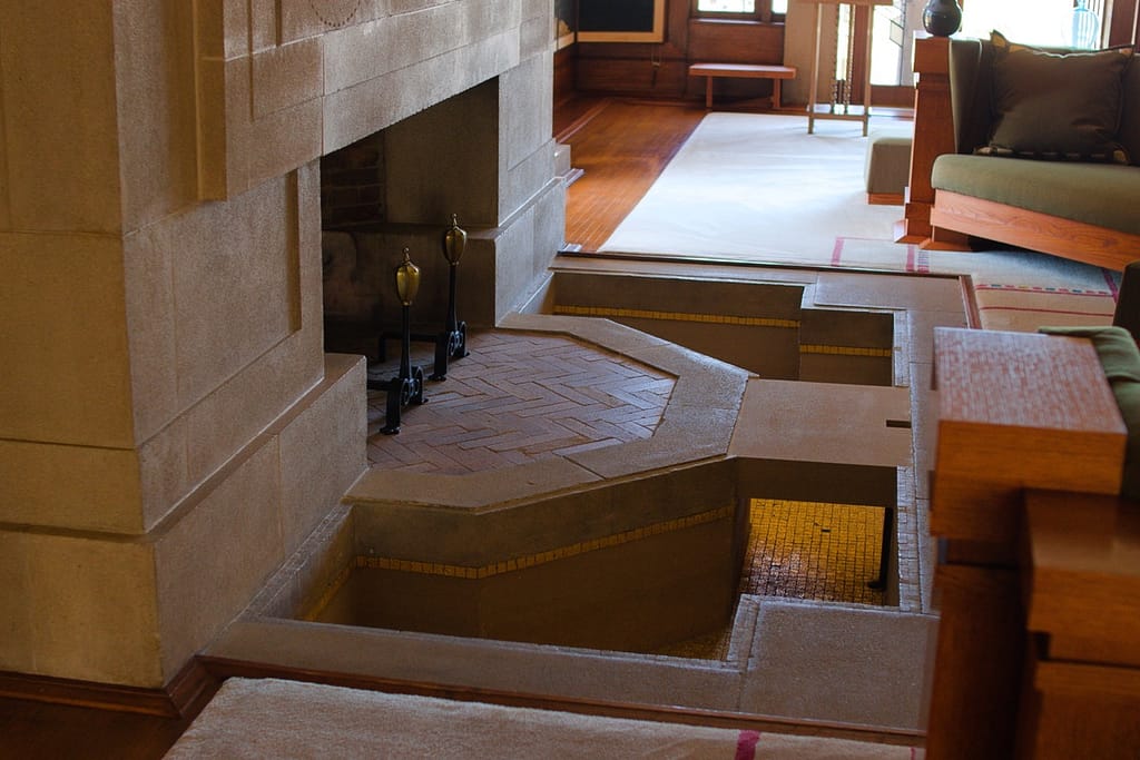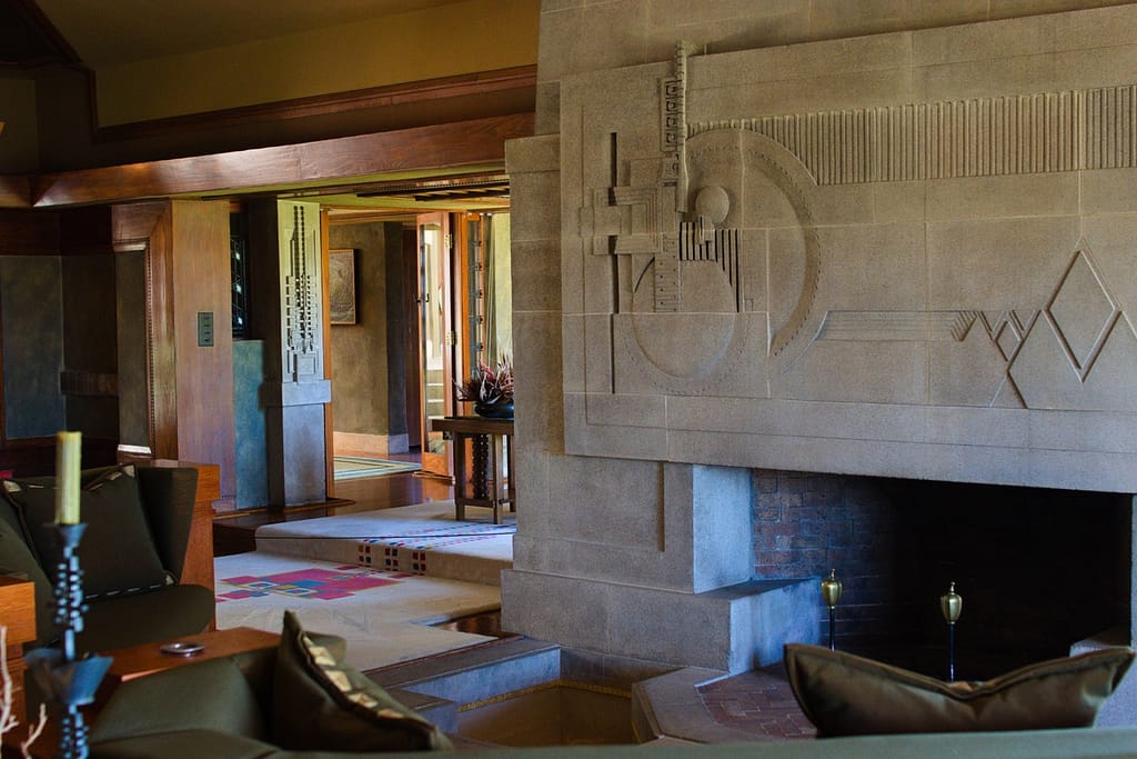 The centerpiece of the house and one of the most magnificent features is the fireplace. For Frank Lloyd Wright, the hearth was the center of the home and the fireplace in the Hollyhock House makes a statement like none other I’ve seen. The relief area around it was meant to feature water (a common theme in his architecture), but due to plumbing issues it didn’t work properly.