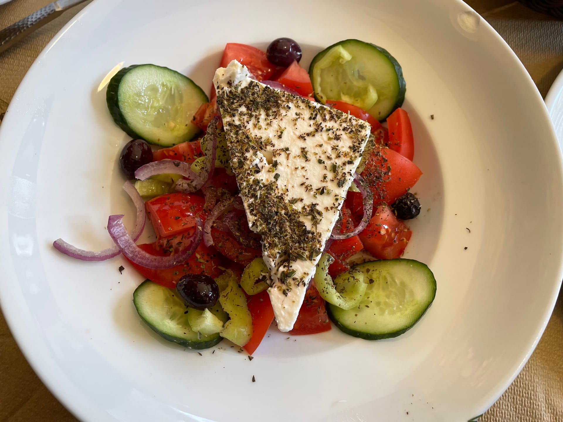 Other than the cheesecake, one of the more memorable dishes was on the island of Rhodes. We had just finished the olive oil tour and wandered into the nearby village for lunch. We stopped at one of two places opened. It is a dish called Bouyourdi, and it is oven baked feta cheese topped with tomato, peppers and herbs. It was the first time in 13 days that we had seen feta in a different form other than crumbled, wedge, or fried. I didn’t know it existed this way. We were told by the chef to eat it within five minutes. I think we finished it in one.