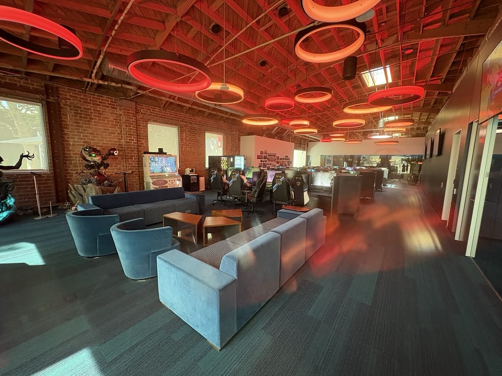 Riot’s headquarters in Santa Monica is unlike any office I’ve ever seen. It’s not just a building, it’s a campus. Multiple buildings are connected by a green courtyard with pomegranate trees, and bamboo groves, shady trees and outdoor seating for people to eat lunch. Right off the courtyard is the cafeteria with breakfast, lunch and dinner, a music room with a full band setup, a coffee shop themed like a scene out of one of their games, with the same level of detail you’d expect at Disney World.