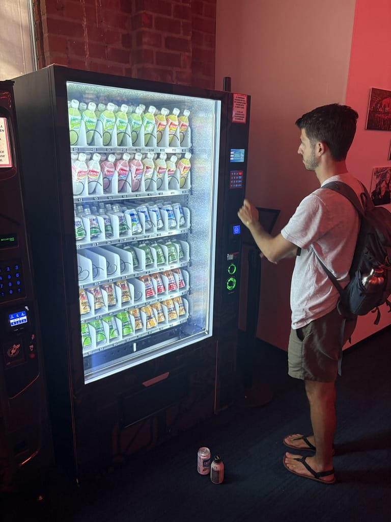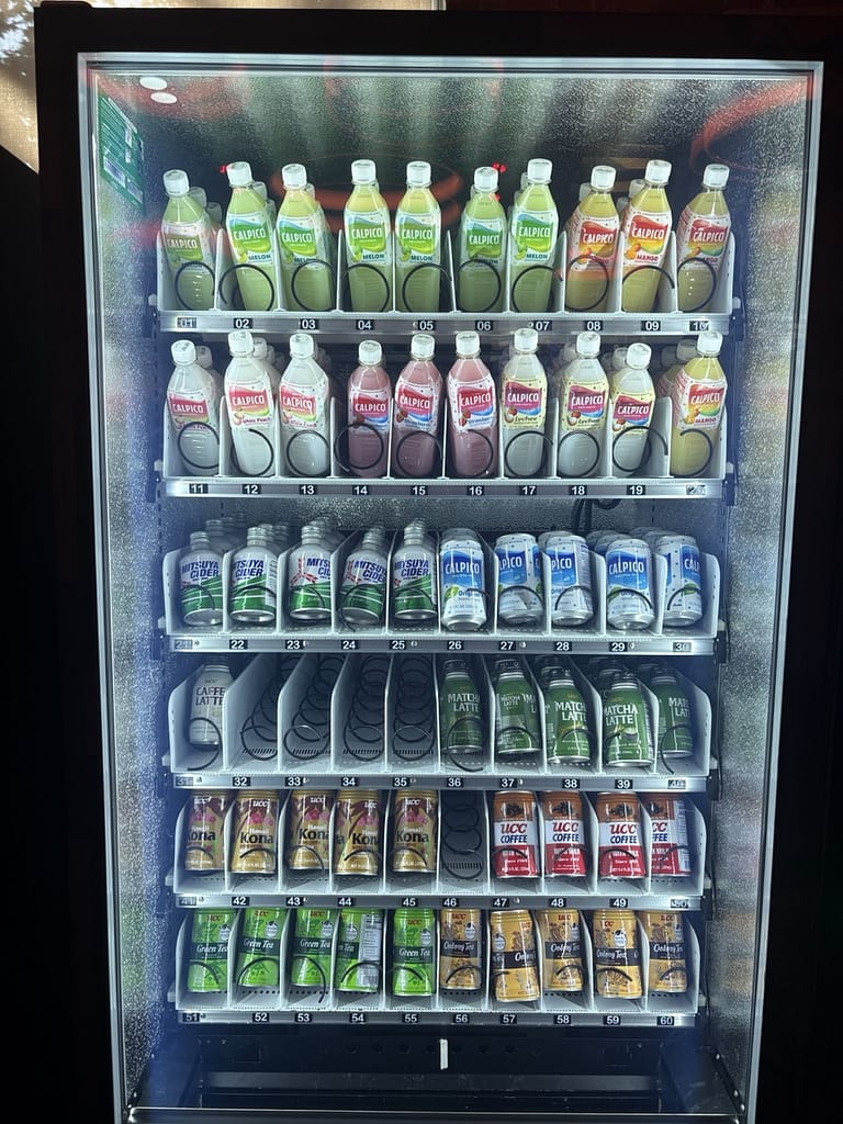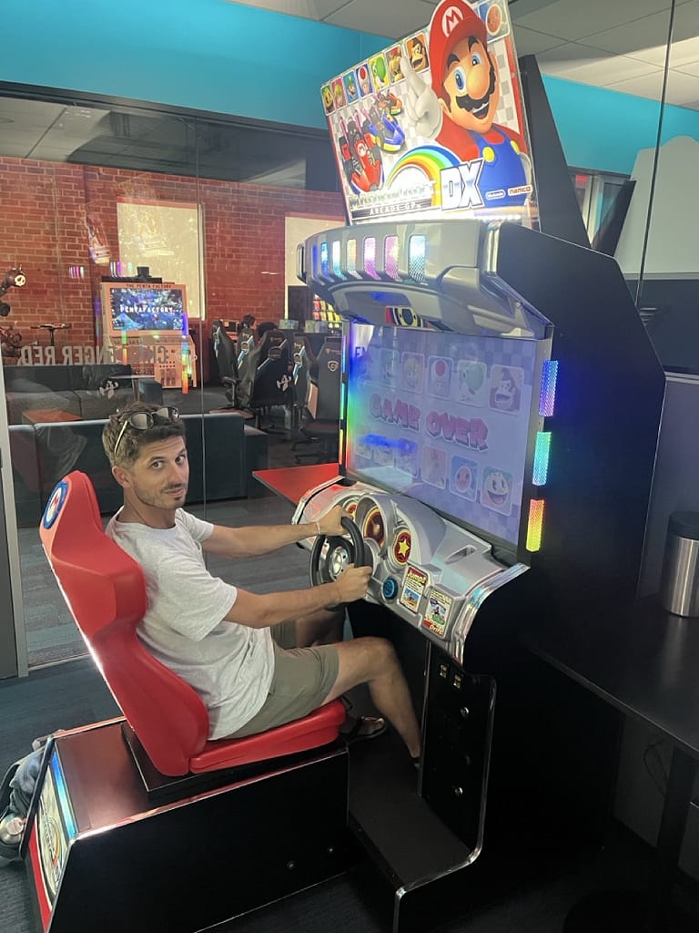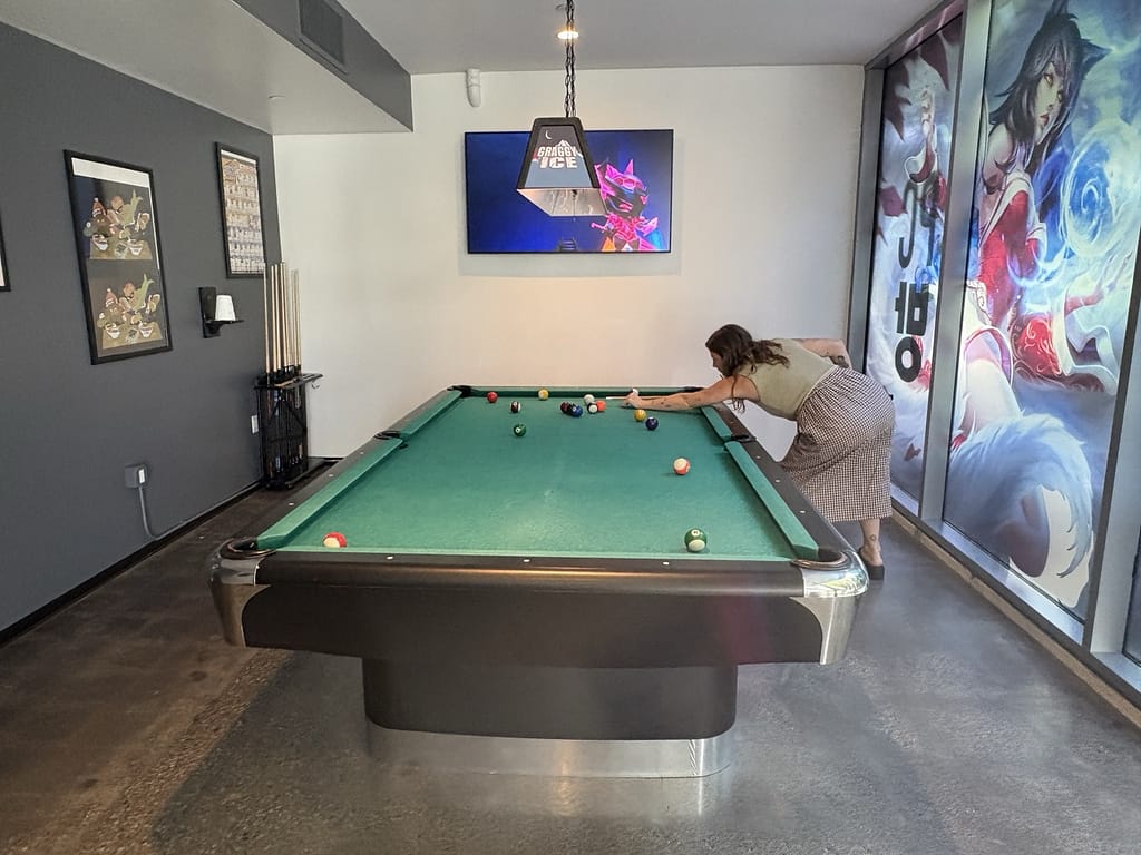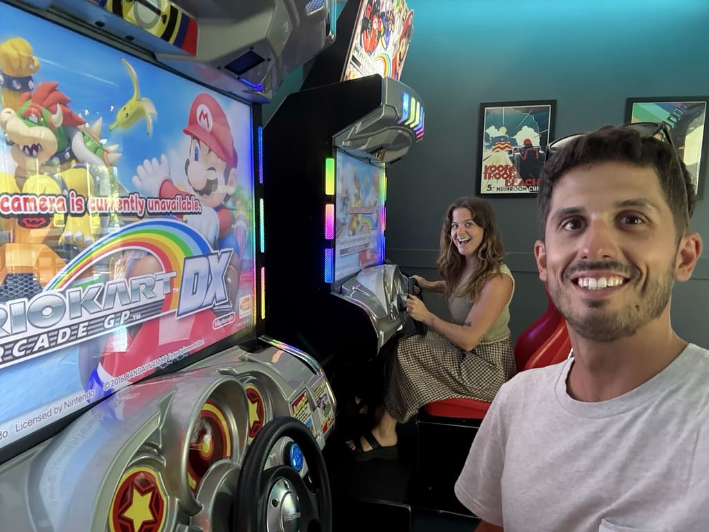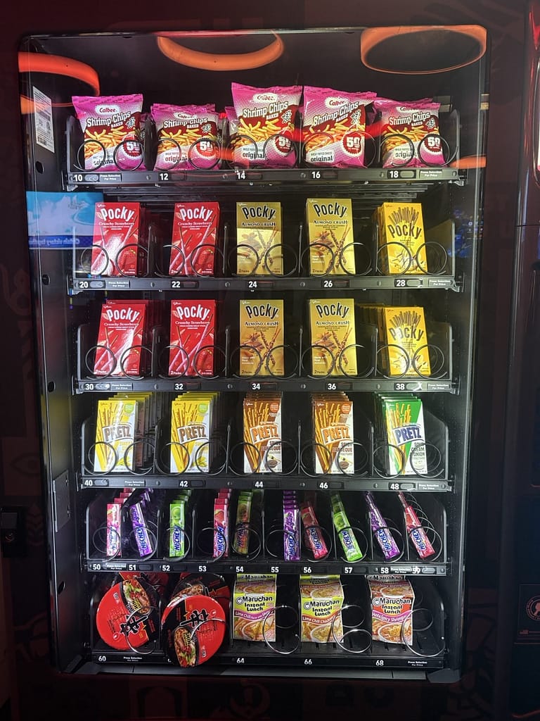 There are also the play spaces. A large room with 40-60 gaming PCs decked out with headphones, mechanical keyboards and gaming mouses, 4 Mario Kart arcade-style racing games, an arcade room with games like the Simpsons arcade game and Dance Dance Revolution, a lounge with 6 large flat screen TVs with every gaming console imaginable. We played Rock Band for about an hour. They have ping-pong and a pool table as well as a variety of free snacks everywhere and vending machines stocked with imported Asian drinks (like a melon milk drink) and Pocky for just 50 cents. Across the street, they even have their own esports arena and a cafe that serves smoothies at all hours. If I worked there, I don’t think I’d ever leave.